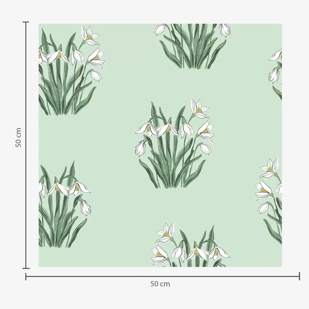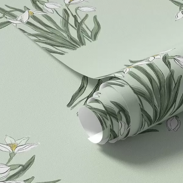 Tapetes Sniegpulkstenītes ar zaļām lapām uz siltā dzeltenā fona Nr. a00651v3