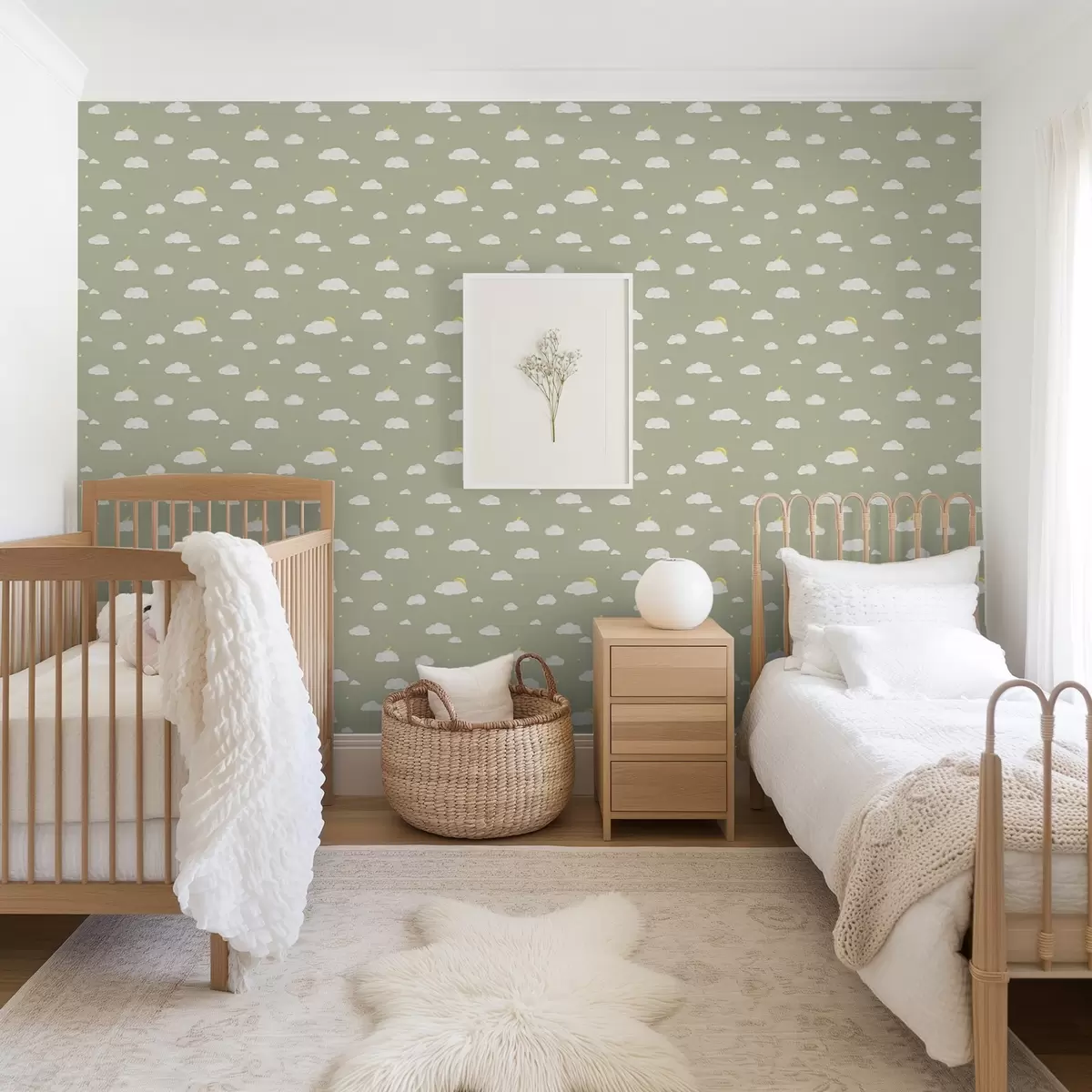 Tapetes Mīksti mākoņi, zvaigznes un saule uz zaļgani pelēka fona Nr. a00652v1