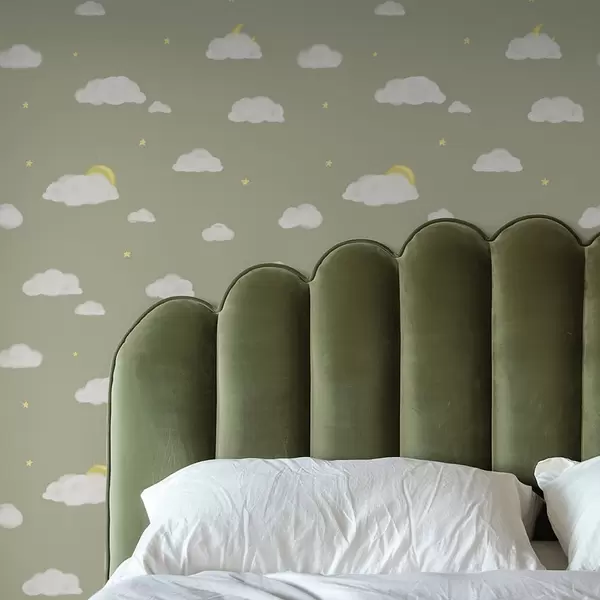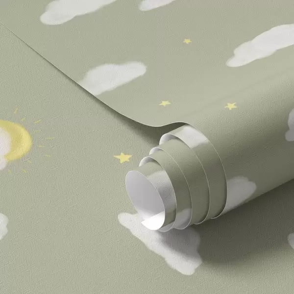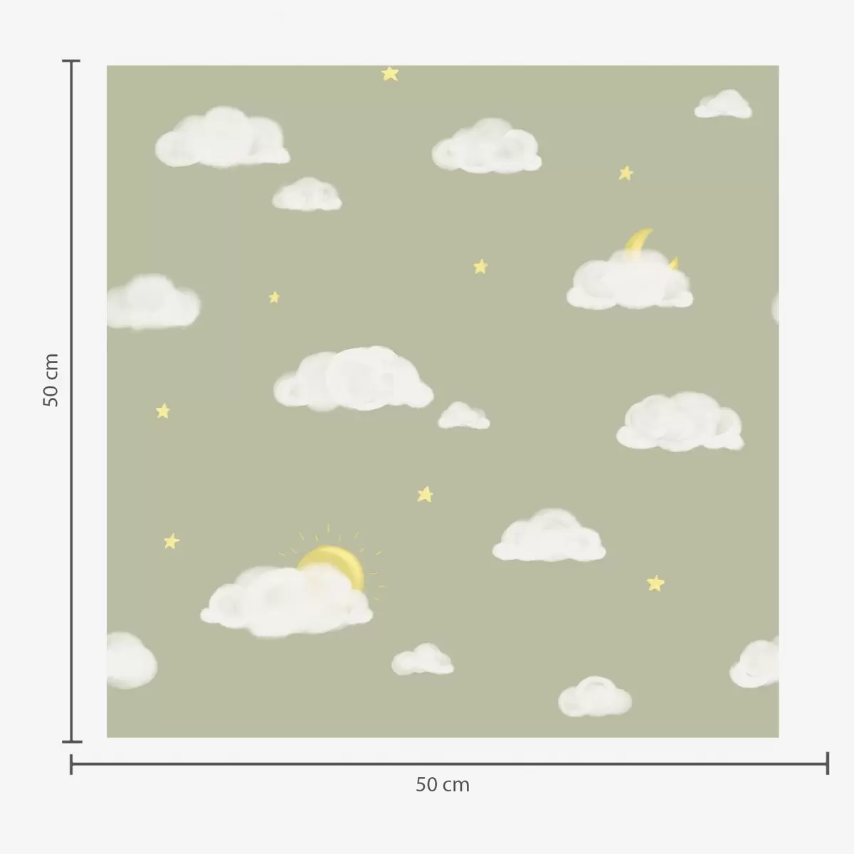 Tapetes Mīksti mākoņi, zvaigznes un saule uz zaļgani pelēka fona Nr. a00652v1