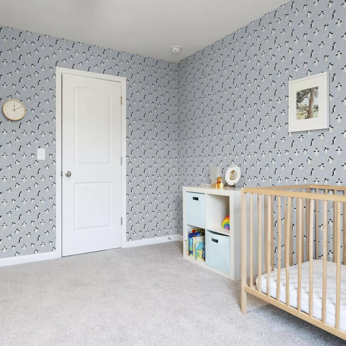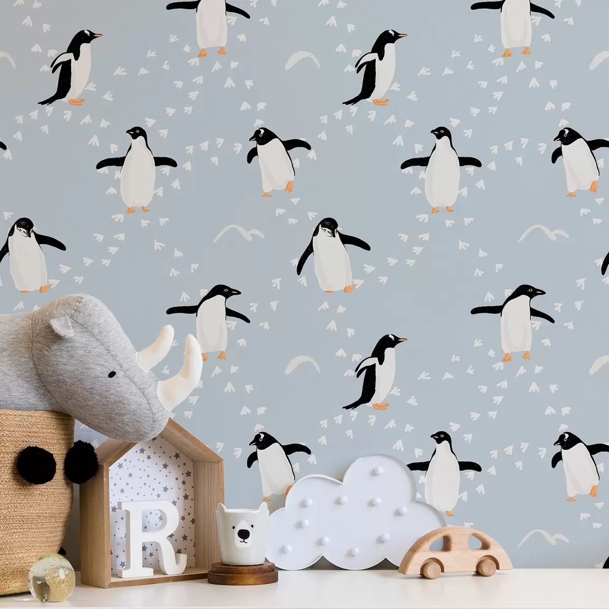 Tapetes Pingvīni uz gaiši zila fona, pēdu ritms Nr. a00655v2