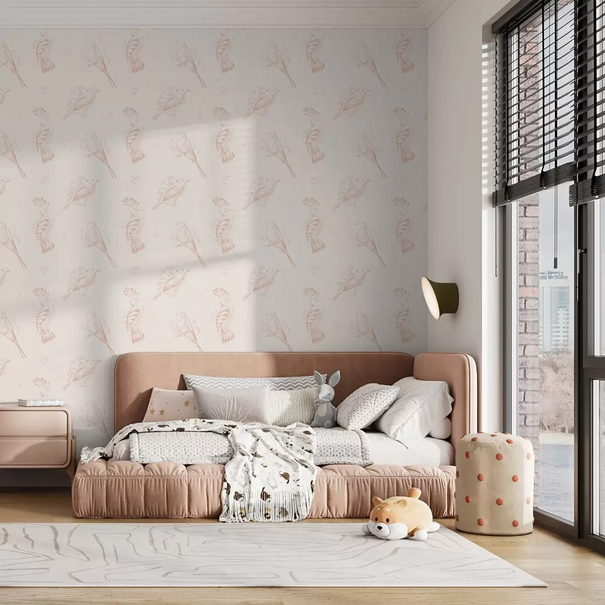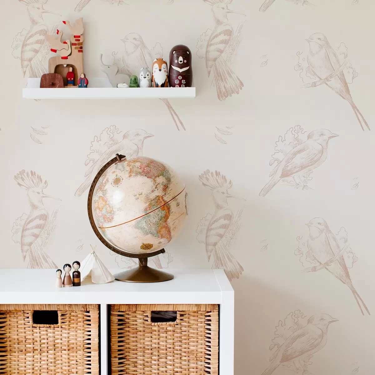 Tapetes Putnu audums: skices putni uz persiku krāsas auduma Nr. a00656v2