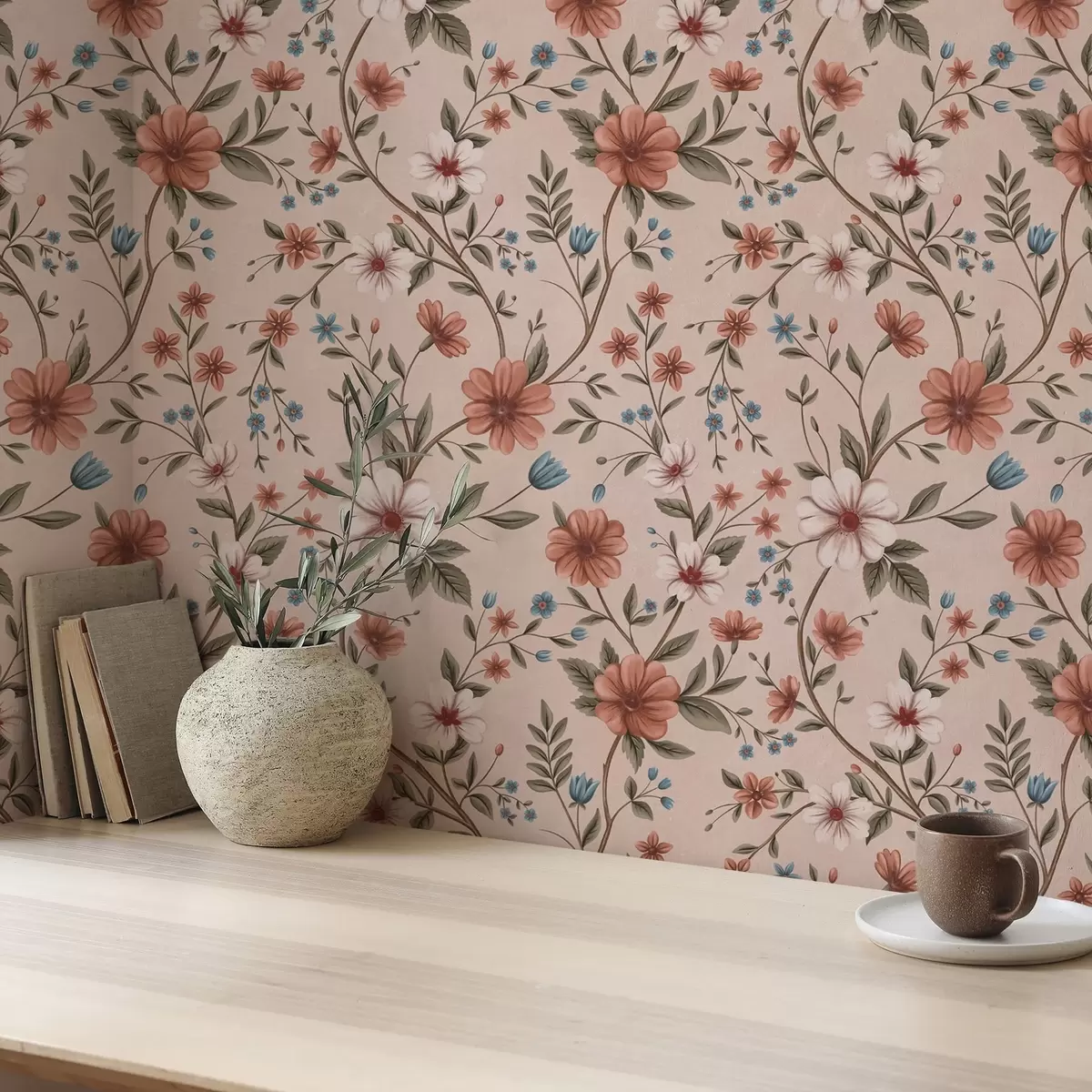 Tapetes Rozā-koraļļu ziedi un lapas uz putekļainā rozā fona Nr. a00667