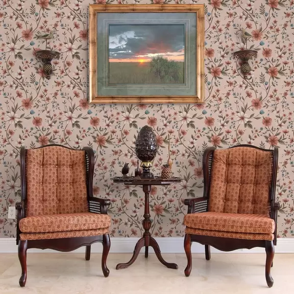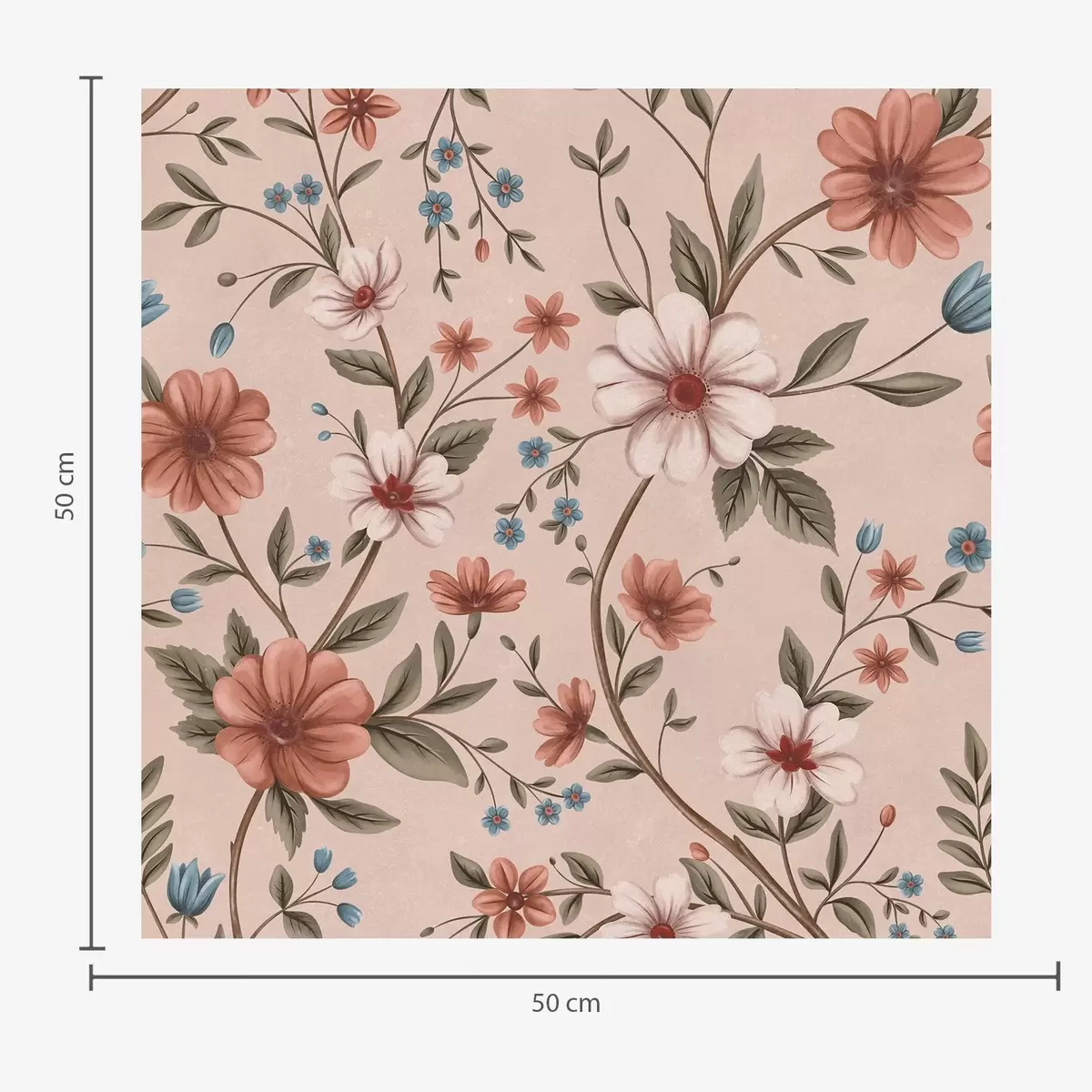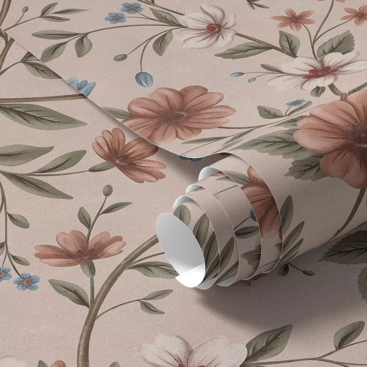 Tapetes Rozā-koraļļu ziedi un lapas uz putekļainā rozā fona Nr. a00667