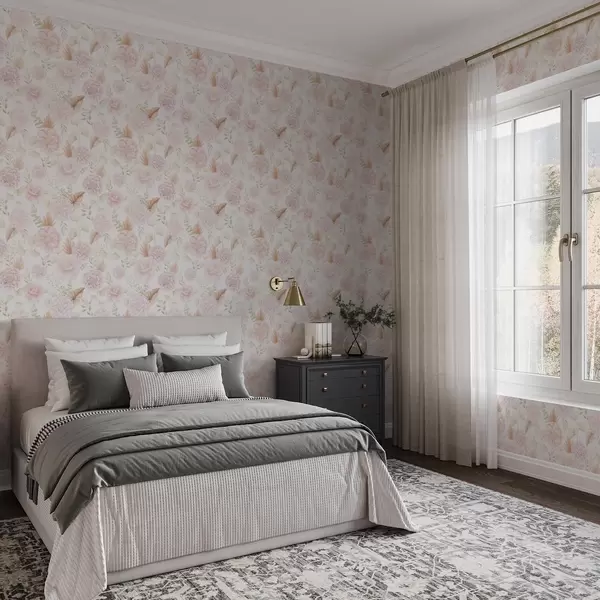Tapetes Maigas pasteļtoņu peonijas un lapas uz balta fona Nr. a00669