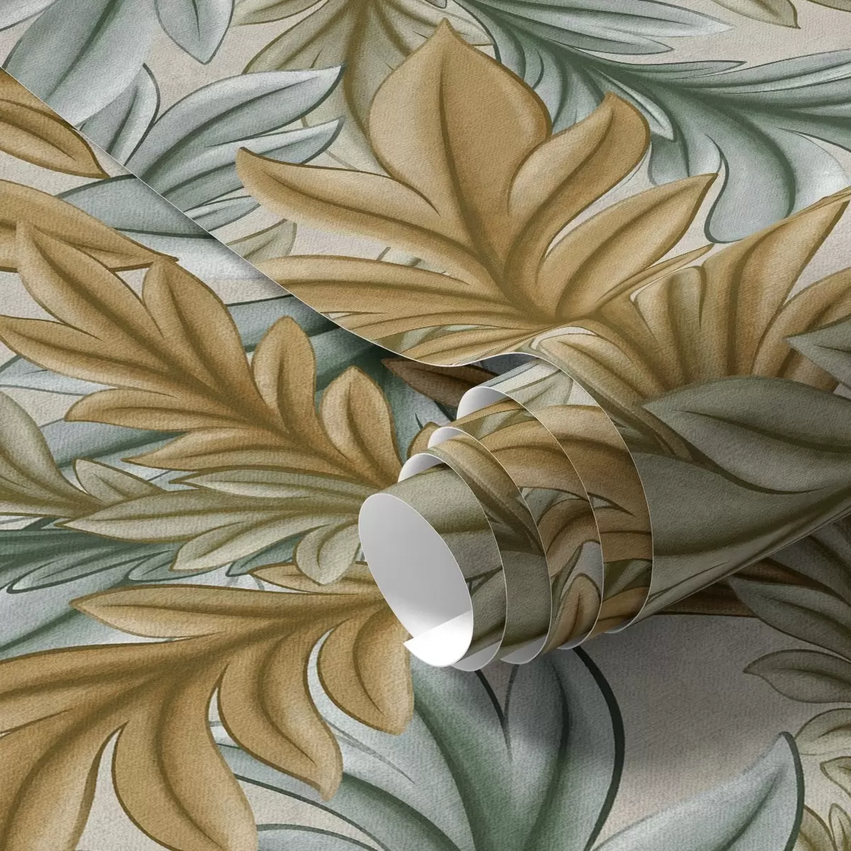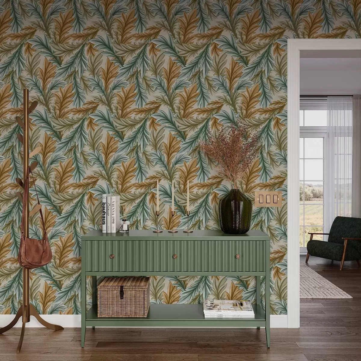 Tapetes Dekoratīvie lapu koki siltā okera un zaļā krāsu gamā Nr. a00673