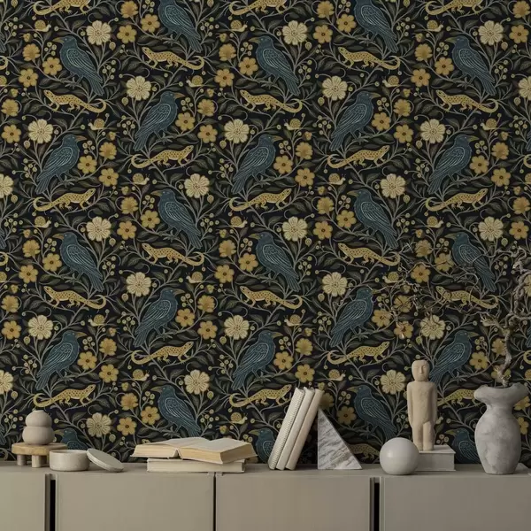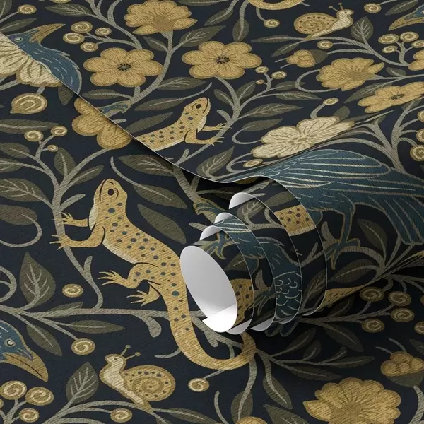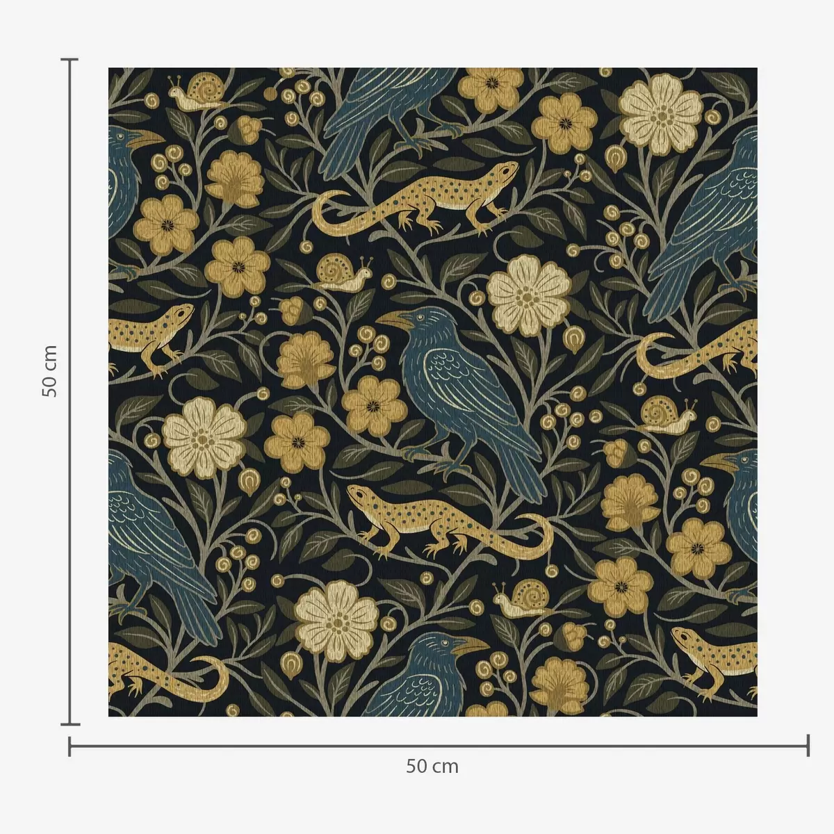 Tapetes Putni, ķirzakas un gliemeži starp ziediem uz tumša fona Nr. a00691
