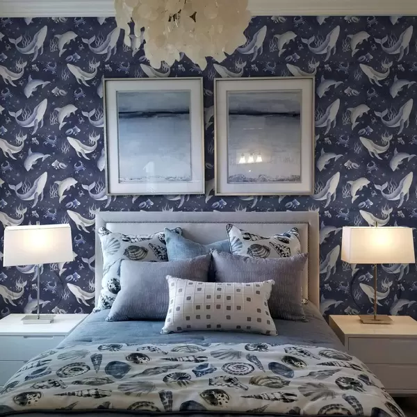 Tapetes Jūras vaļi, delfīni un krabji uz tumši zila fona Nr. a00720