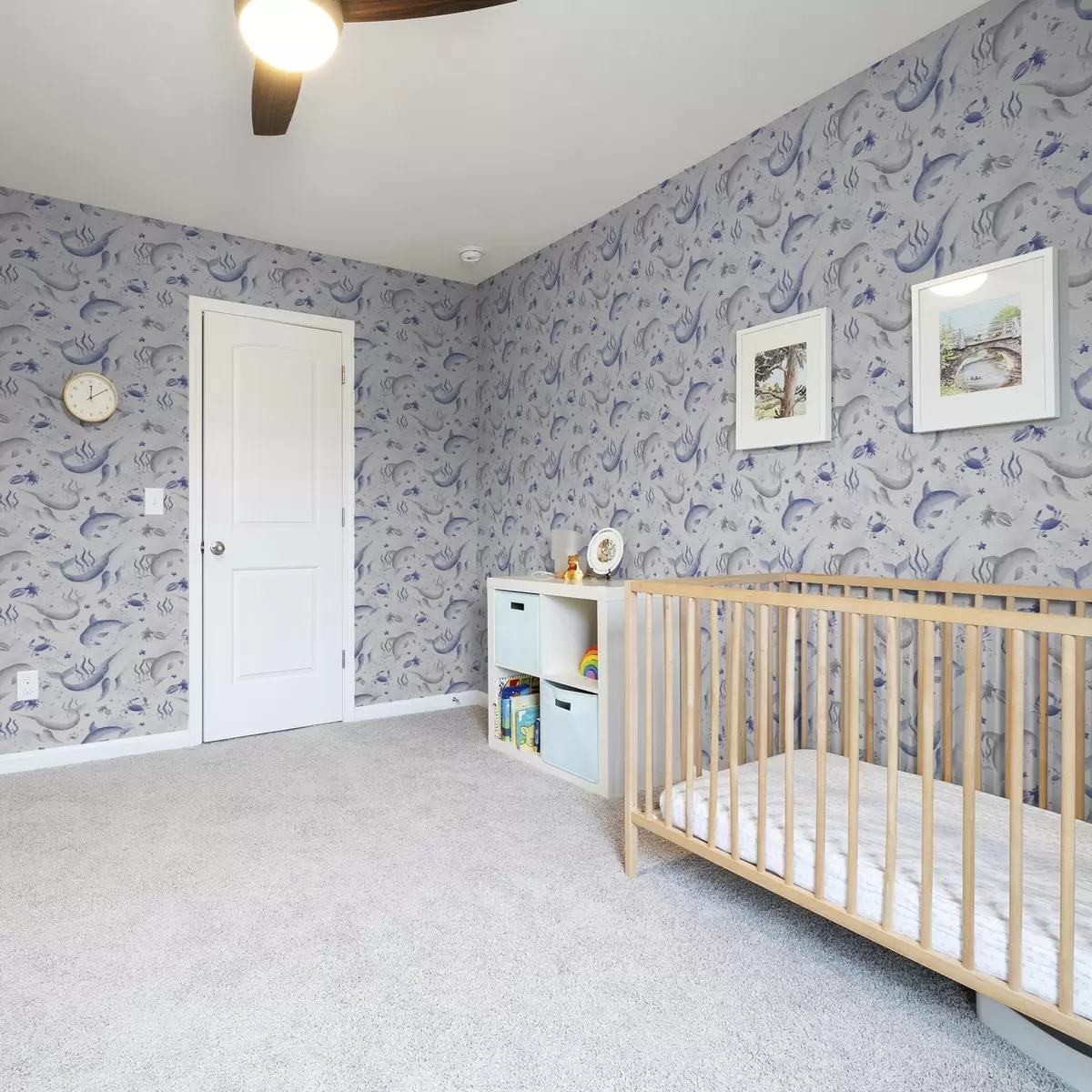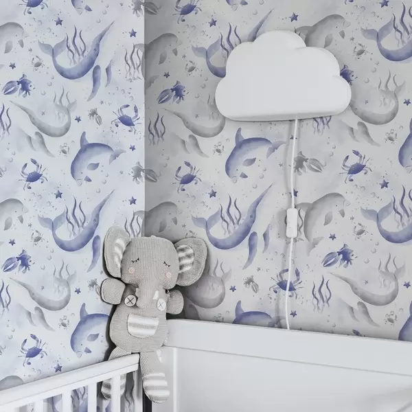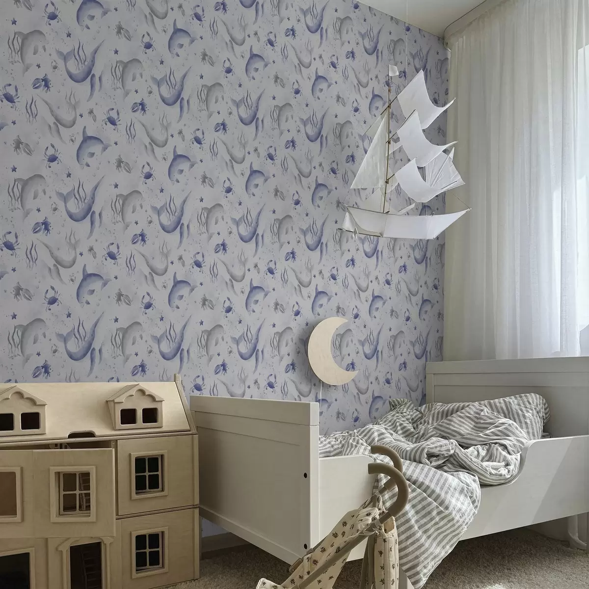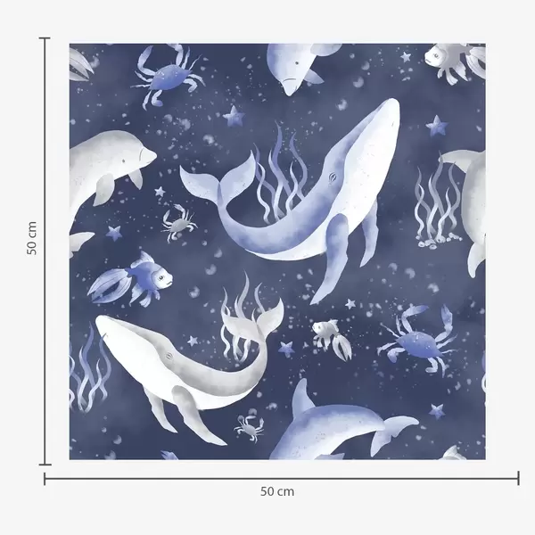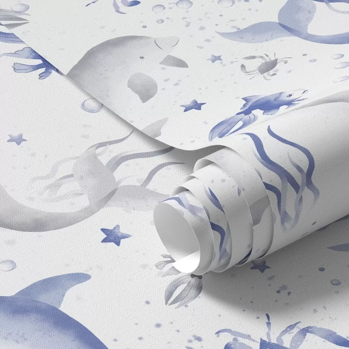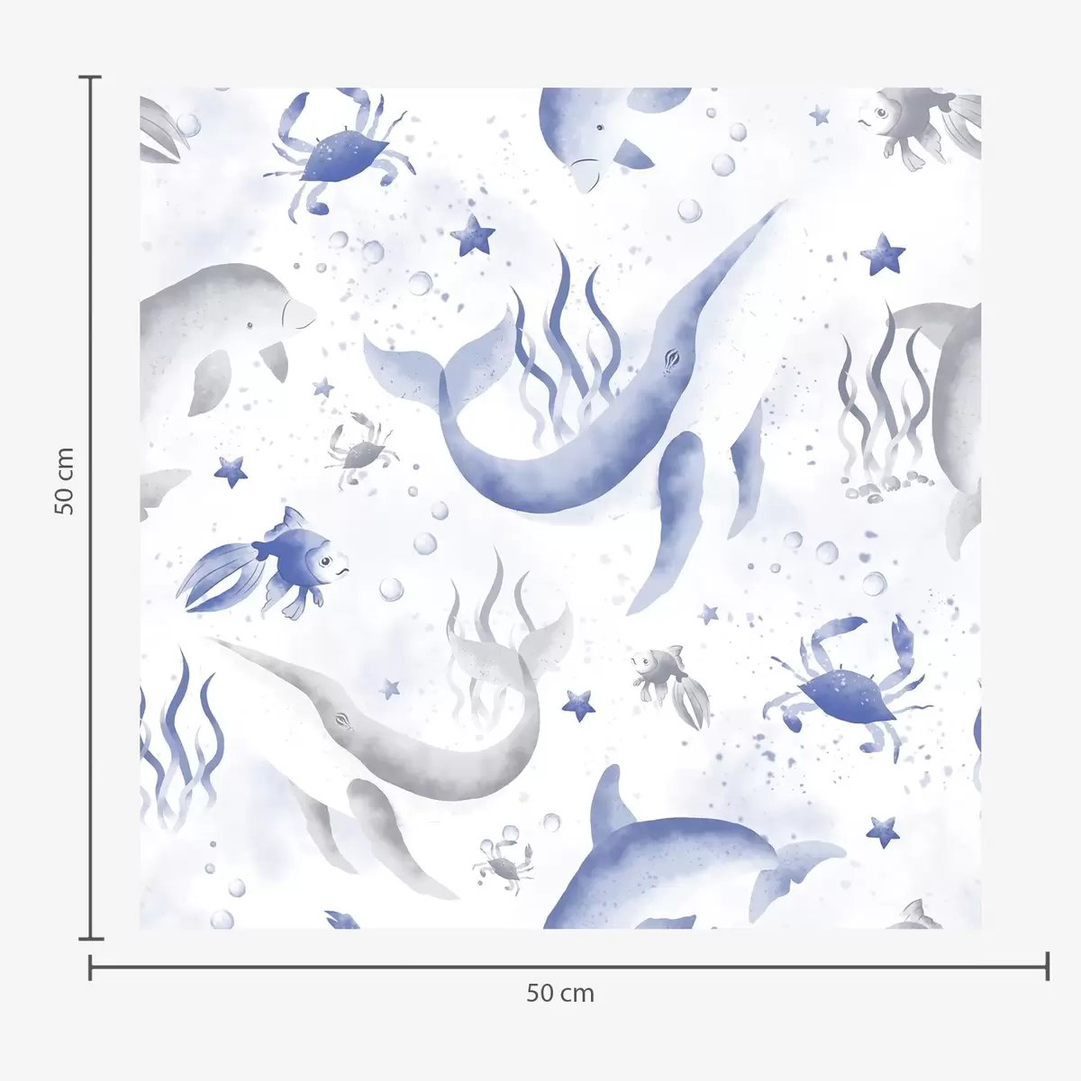 Tapetes Jūras vaļi un delfīni zilos toņos uz balta fona Nr. a00720v1