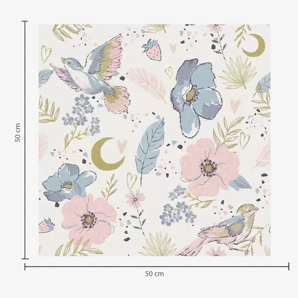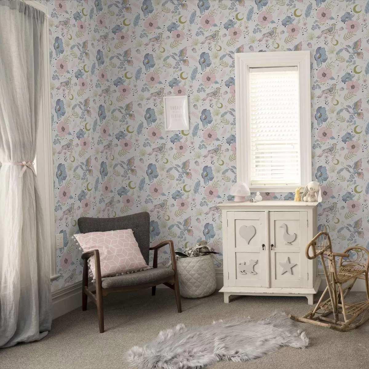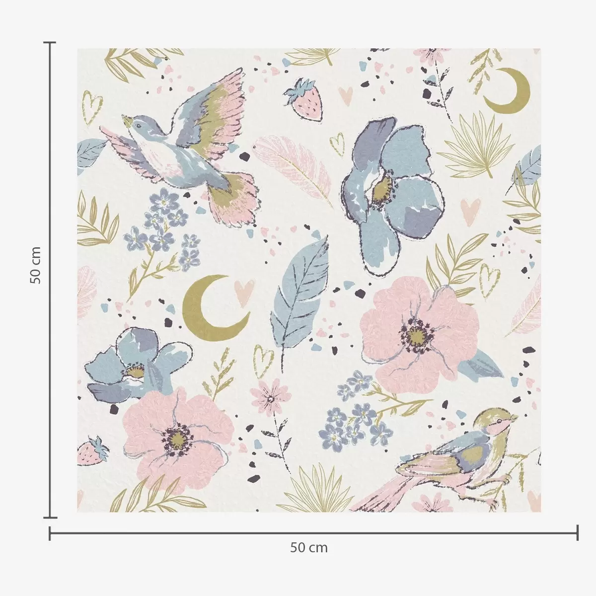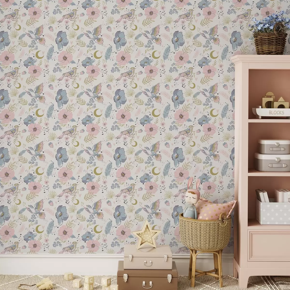 Tapetes Pastelkrāsas putni un ziedi ar pusmēness uz balta fona Nr. a00721