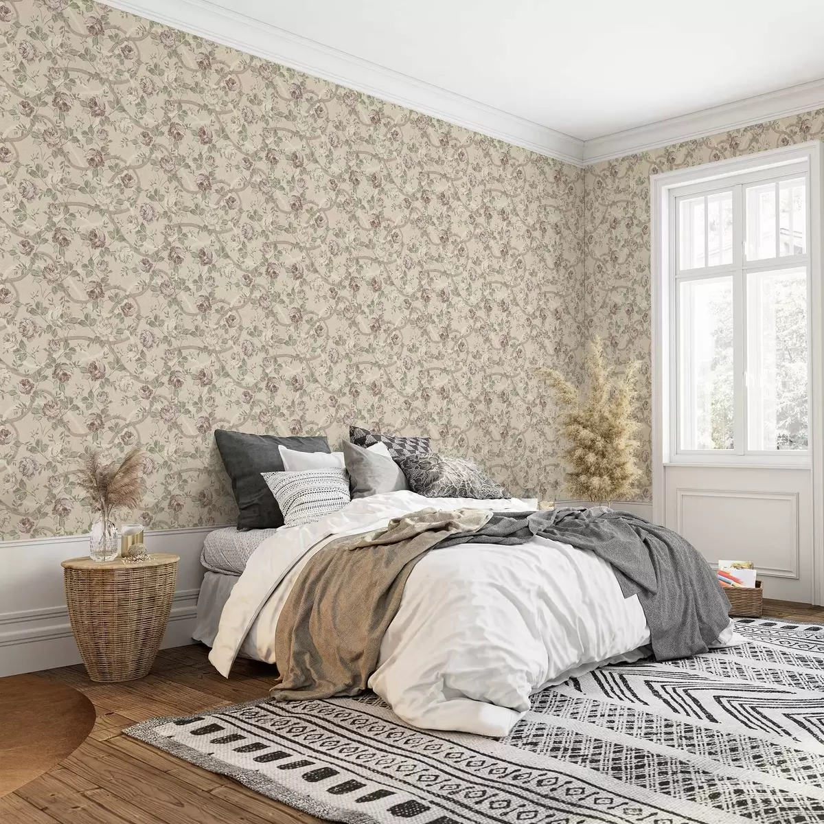 Tapetes Rozes ar zaļām lapām uz siltā smilškrāsas fona Nr. a00729