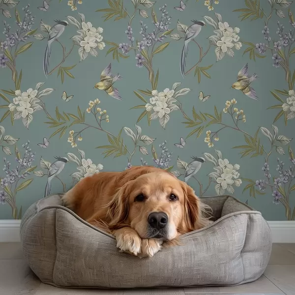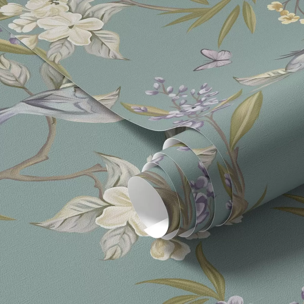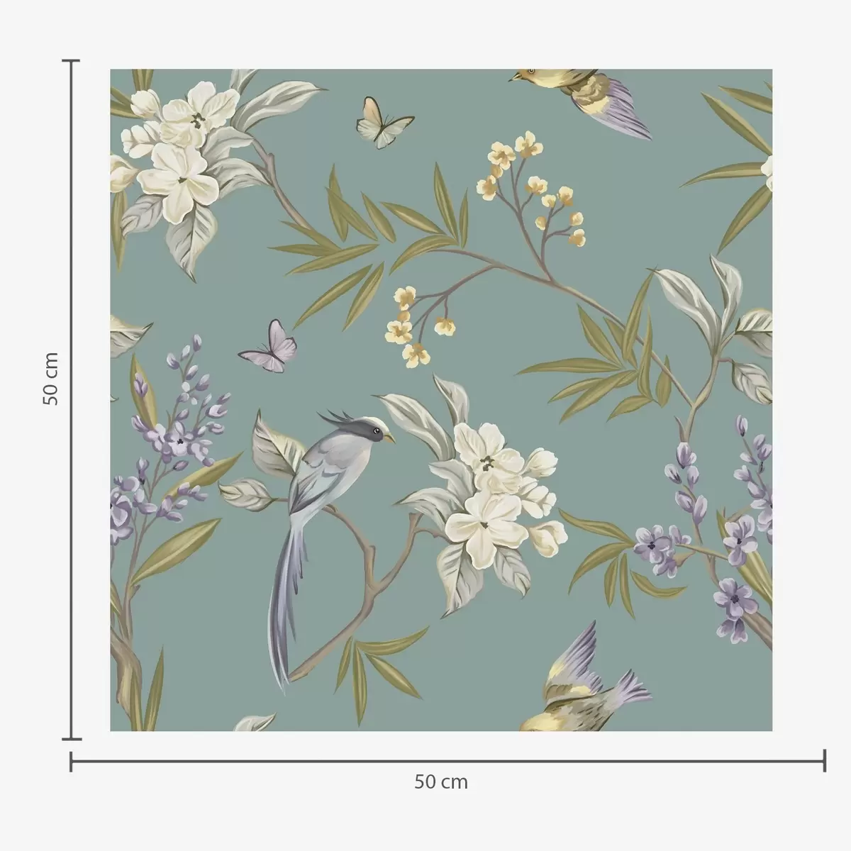 Tapetes Putni, ziedi un tauriņi uz zils pelēka fona Nr. a00735