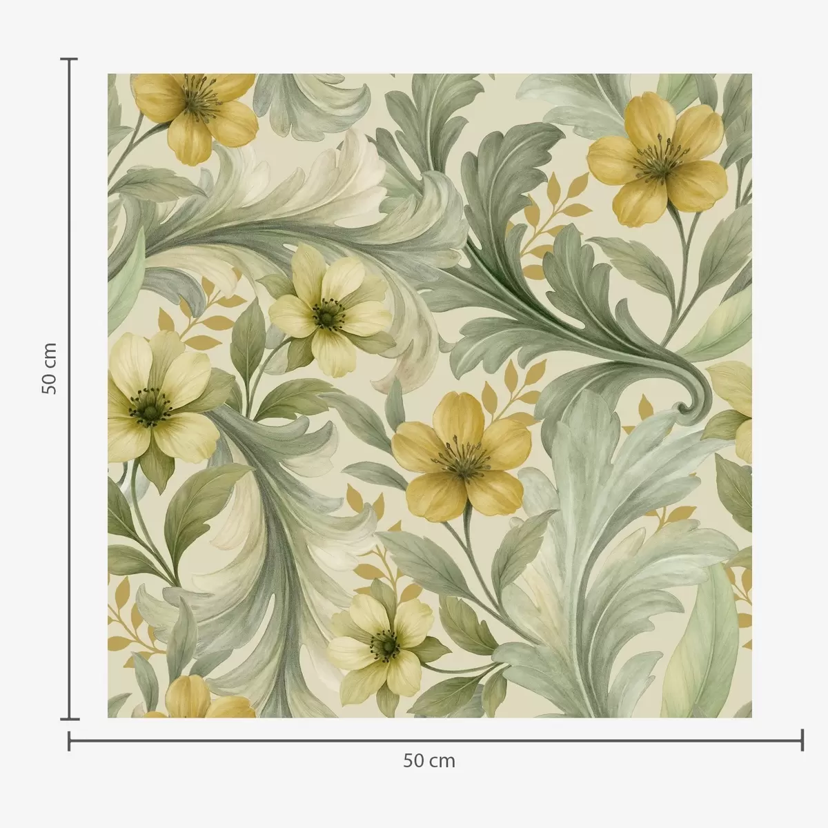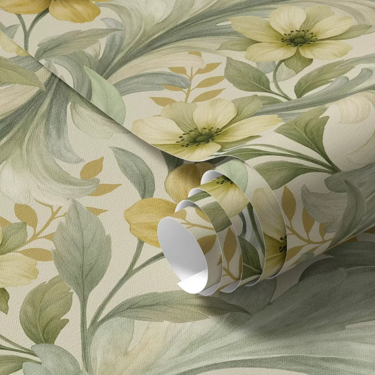 Tapetes Akantu volūtas ar ziediem zaļos un dzeltenos toņos Nr. a00749