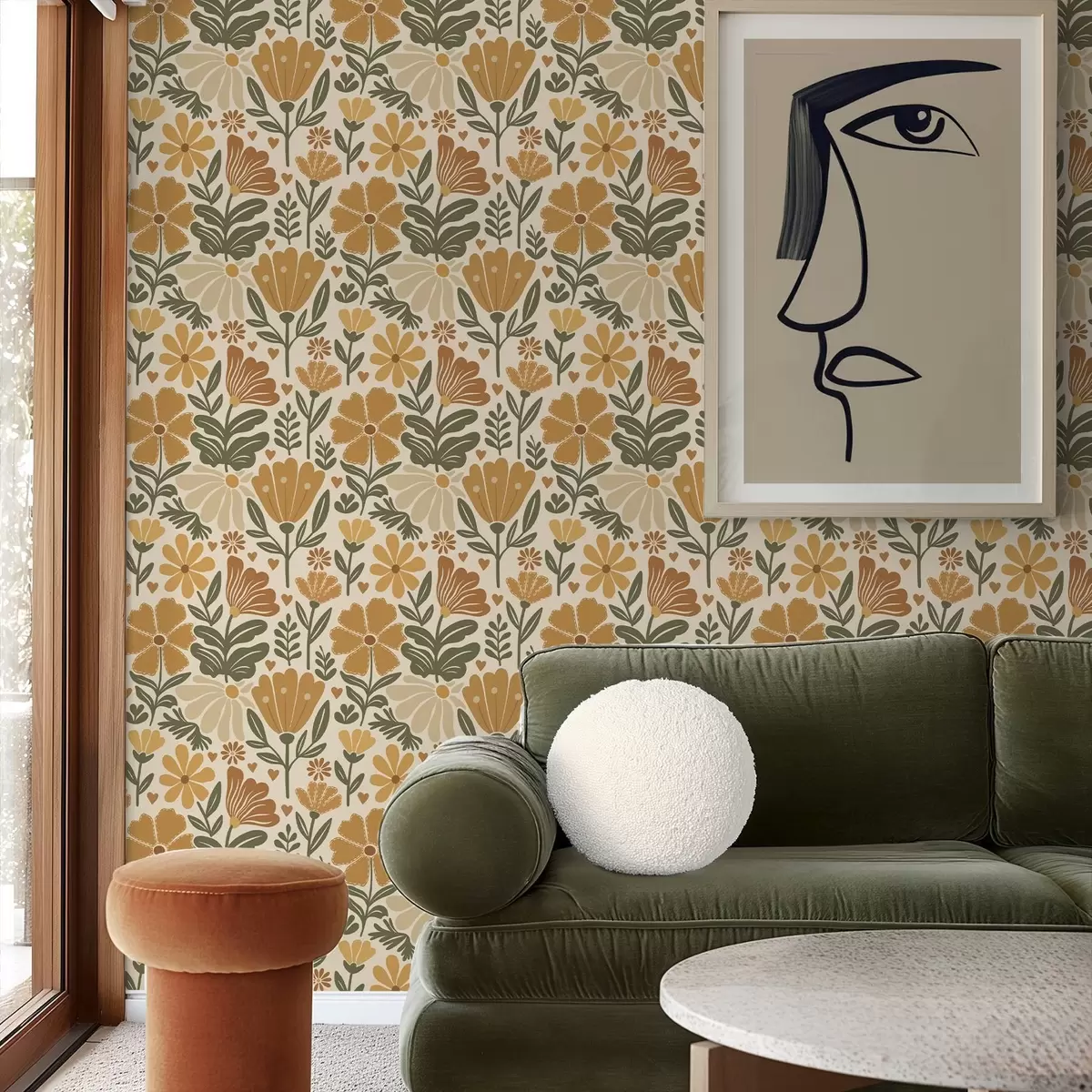 Tapetes Stilizēti ziedi siltos toņos ar sirdīm Nr. a00752