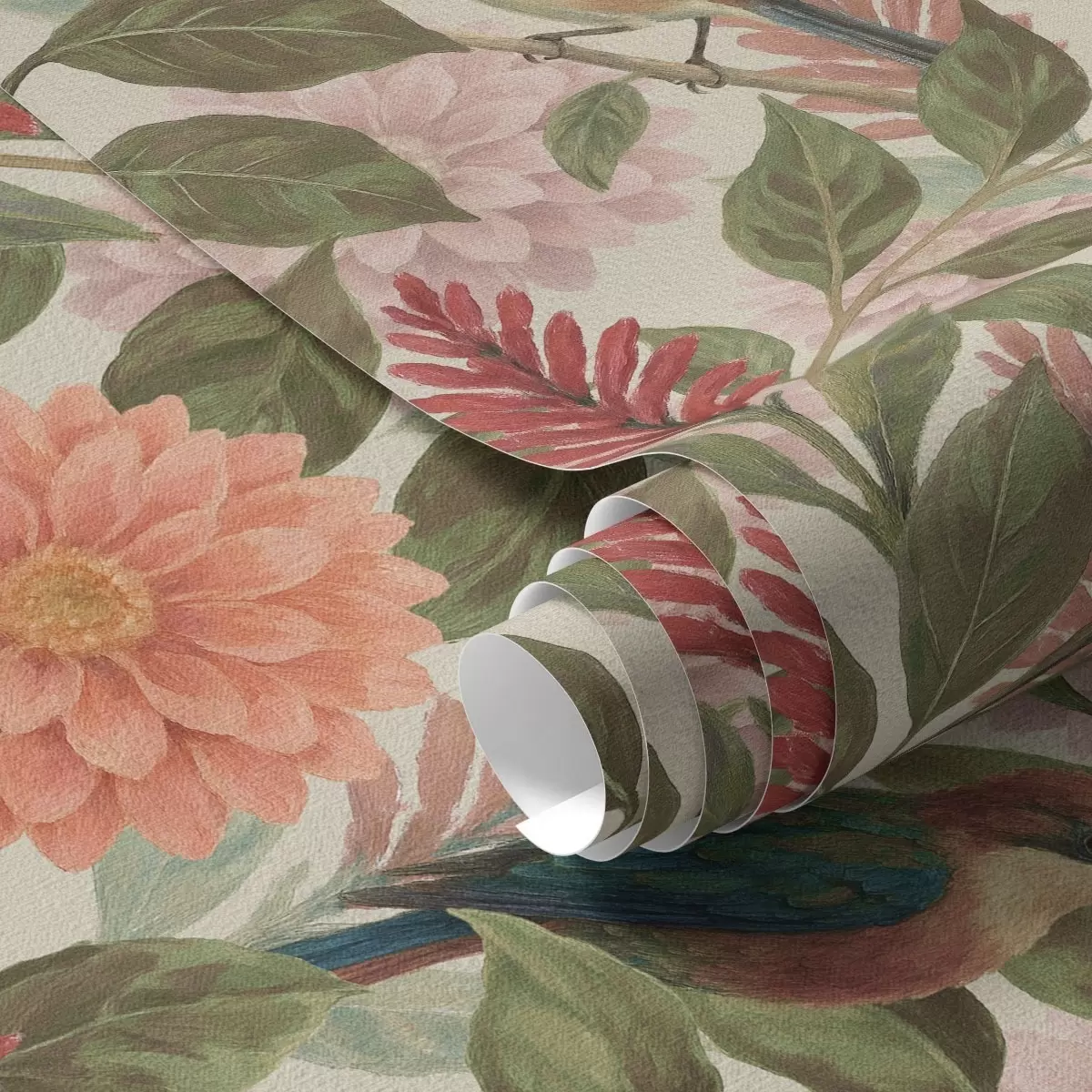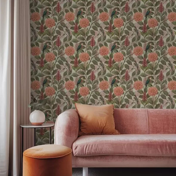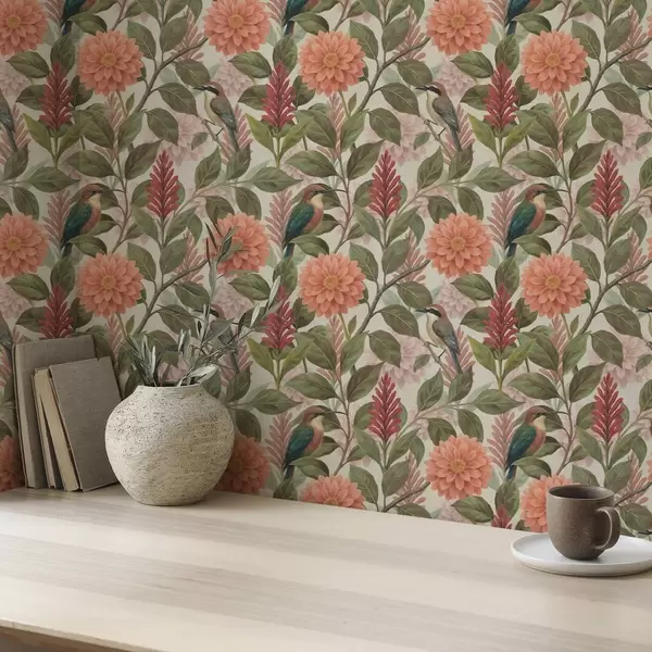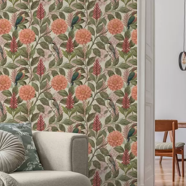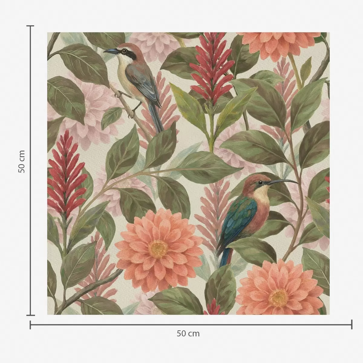Tapetes Putni starp ziediem un lapām siltos toņos Nr. a00753