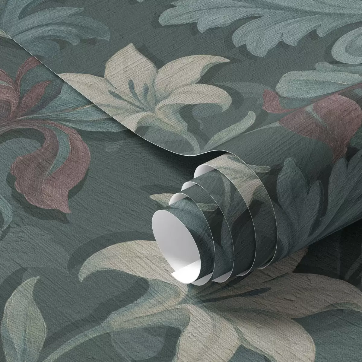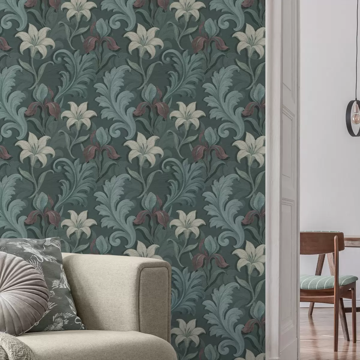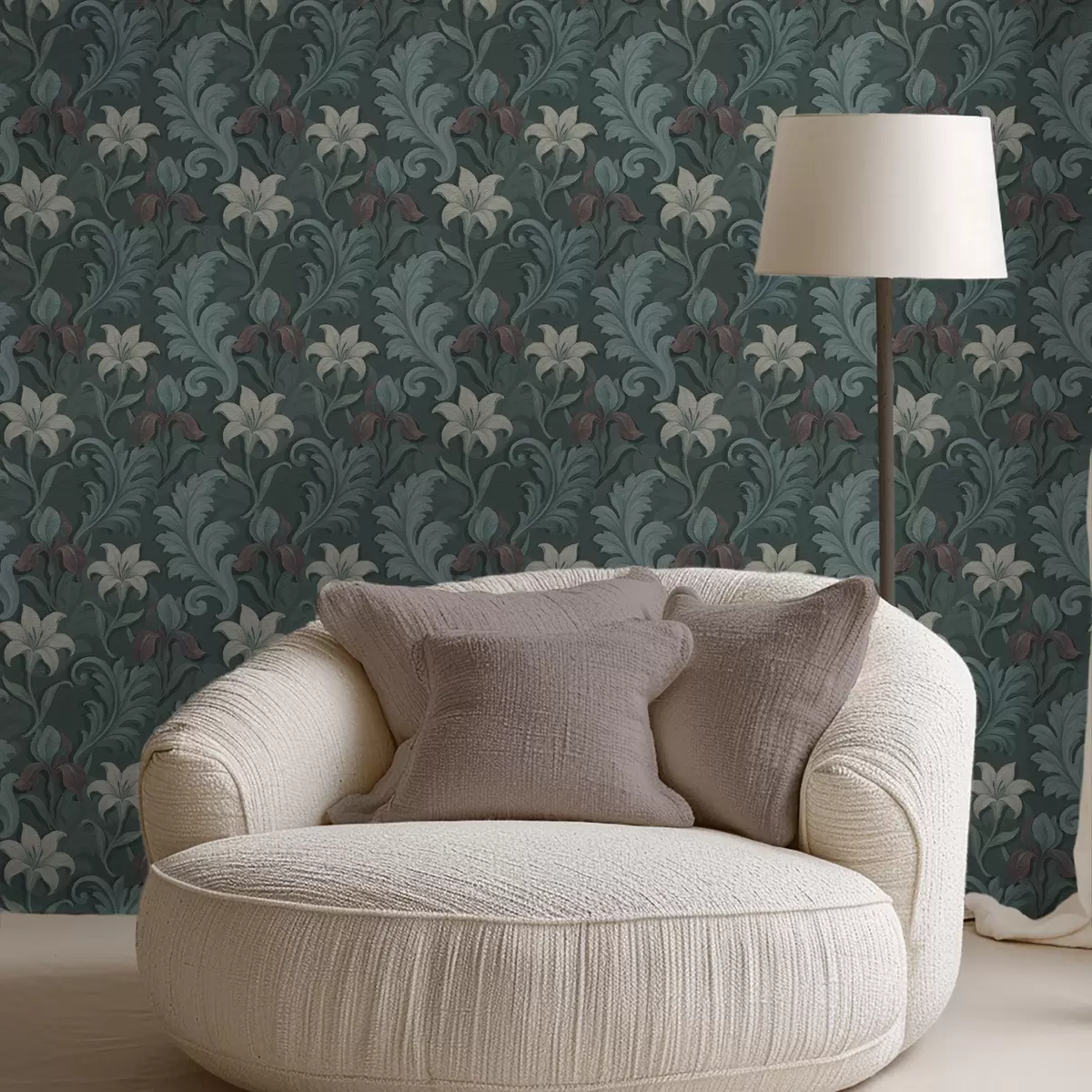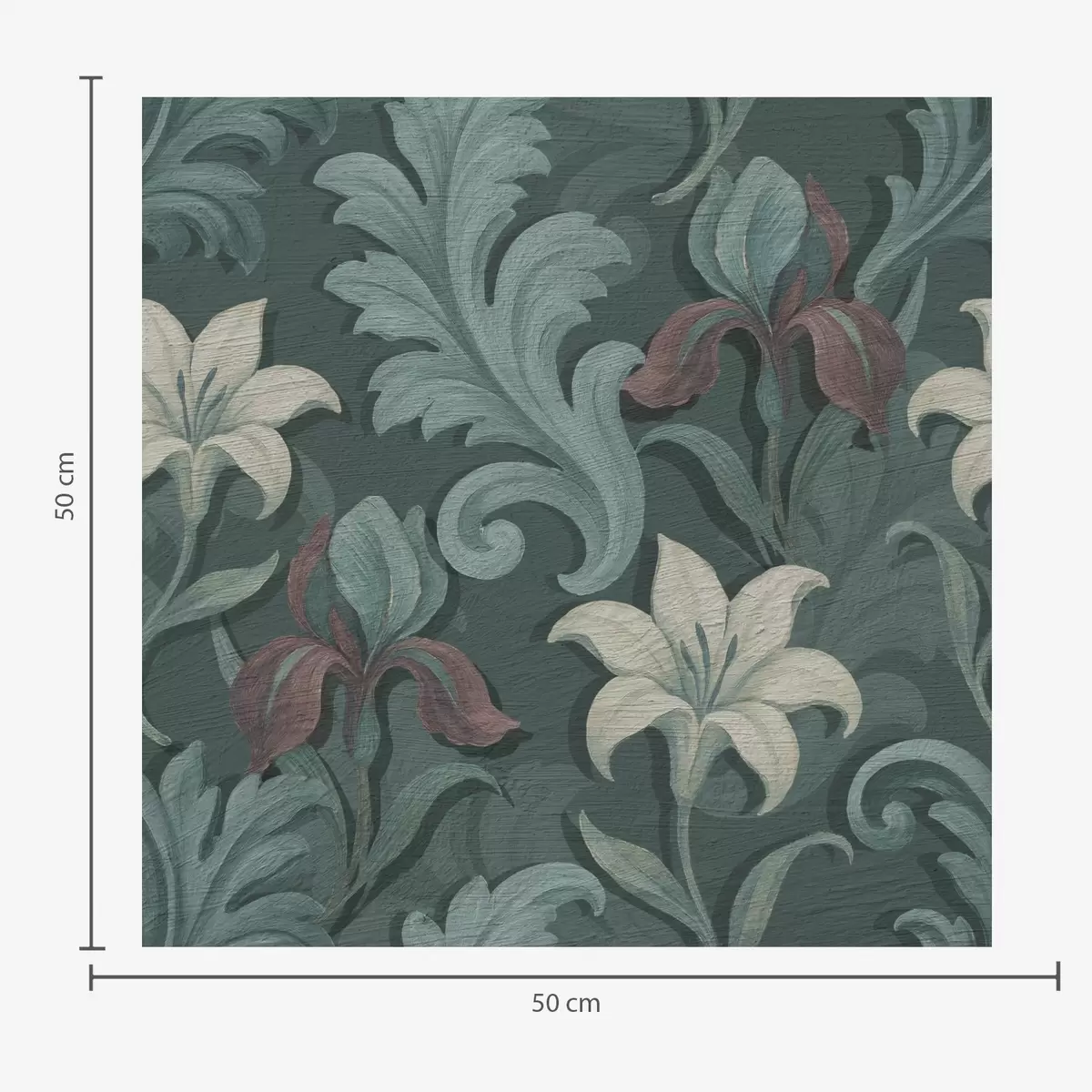 Tapetes Tumši zaļš fons ar īrisiem un dekoratīvām lapām Nr. a00755
