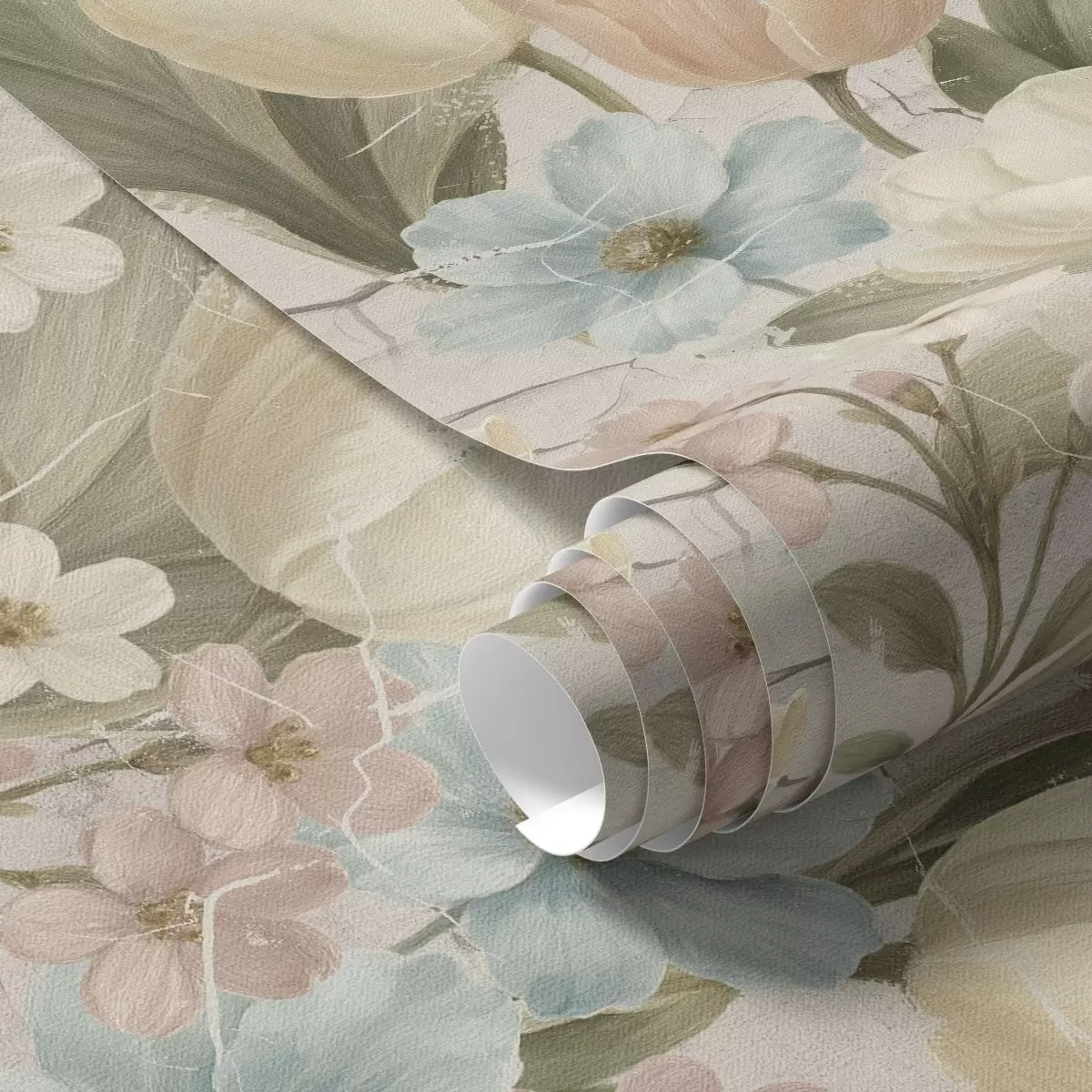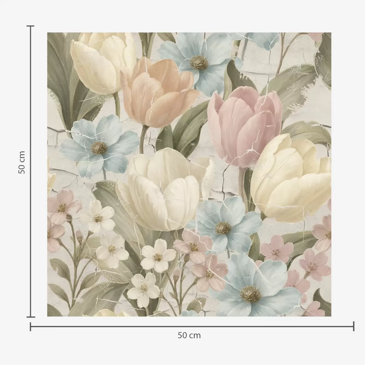 Tapetes Pastelkrāsas tulpes un ziedi uz gaiša, plīstoša fona Nr. a00756