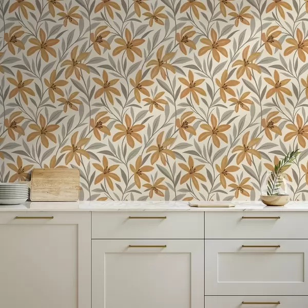 Tapetes Dzeltenas lilijas un pelēkzaļas lapas uz gaiša fona Nr. a00757