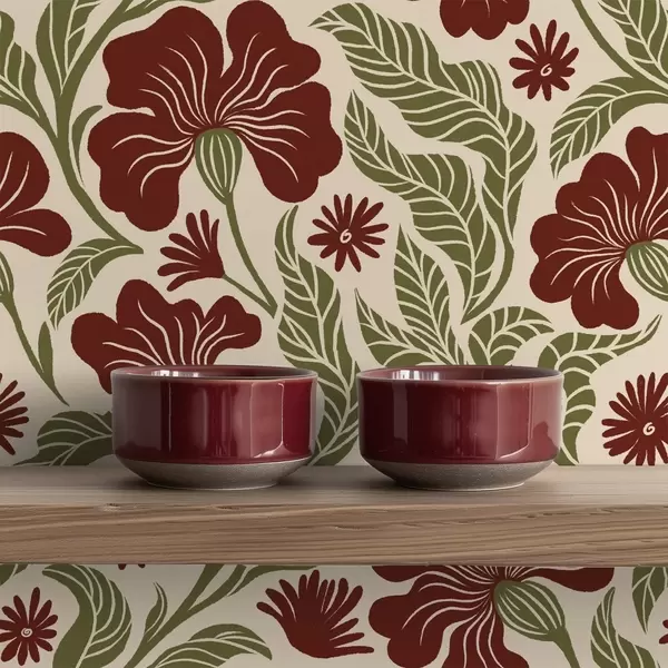 Tapetes Burgundijas ziedi ar zaļām lapām uz gaiša fona Nr. a00761