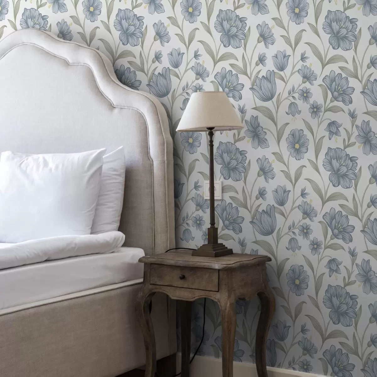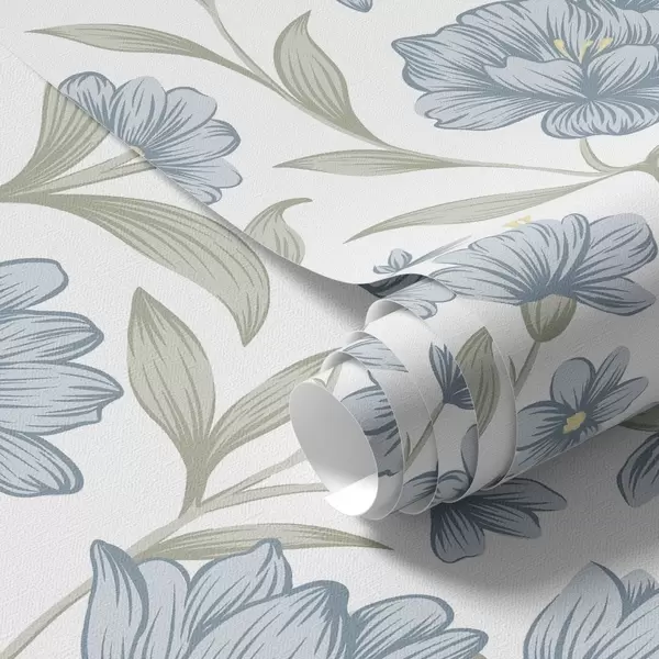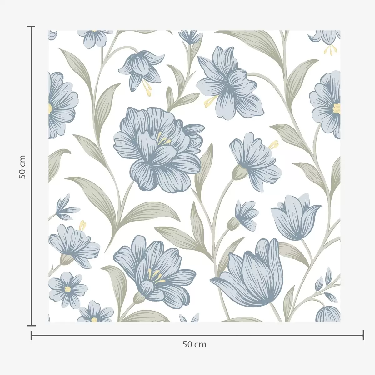 Tapetes Putekļaini zili ziedi ar olīvu lapām uz balta fona Nr. a00780