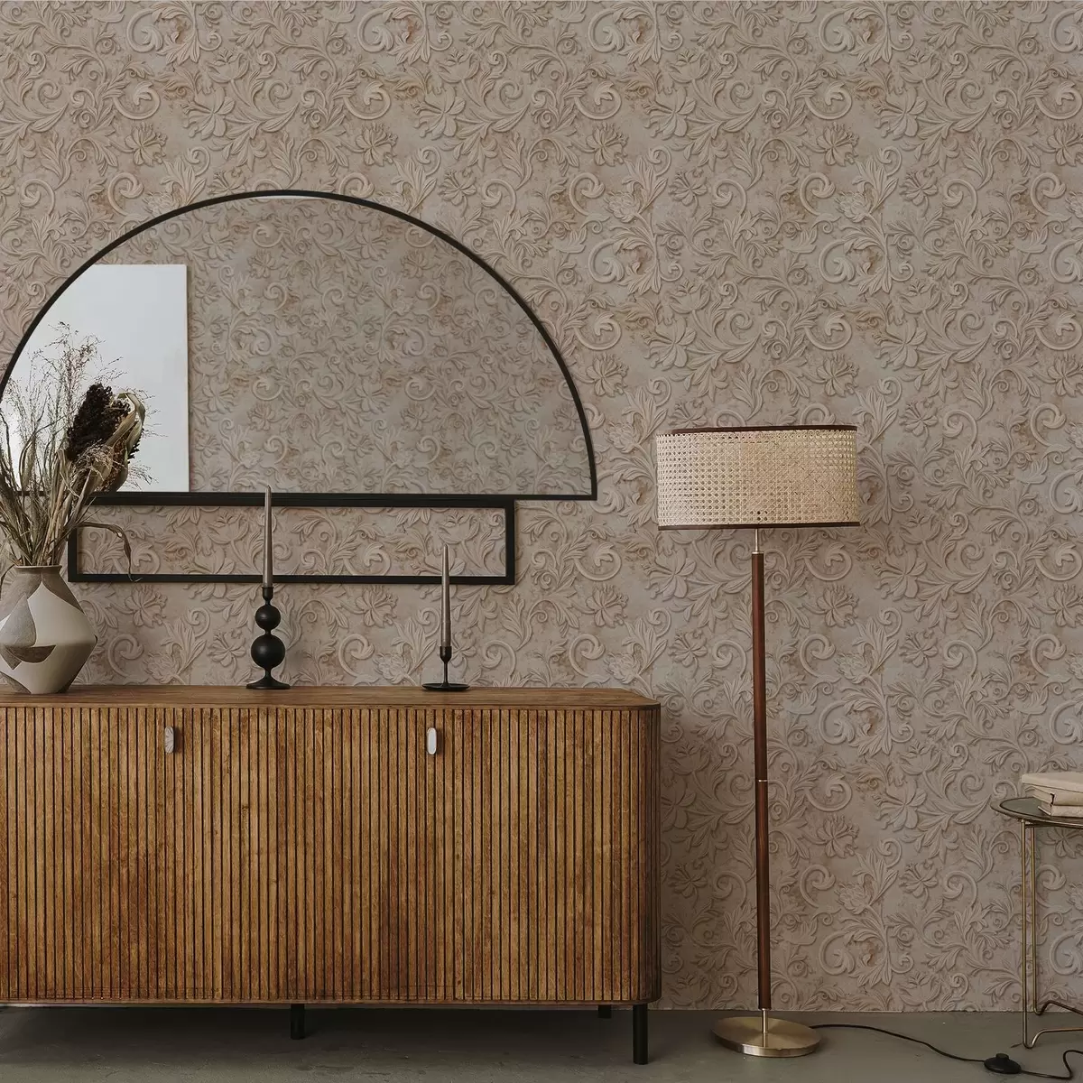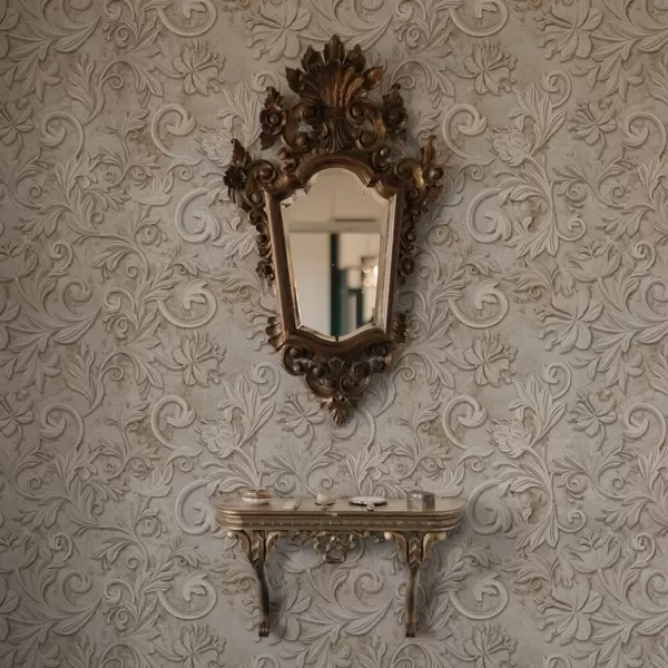 Tapetes Akmens reljefs ar ziedu volūtām, vintage smilškrāsā Nr. a00784