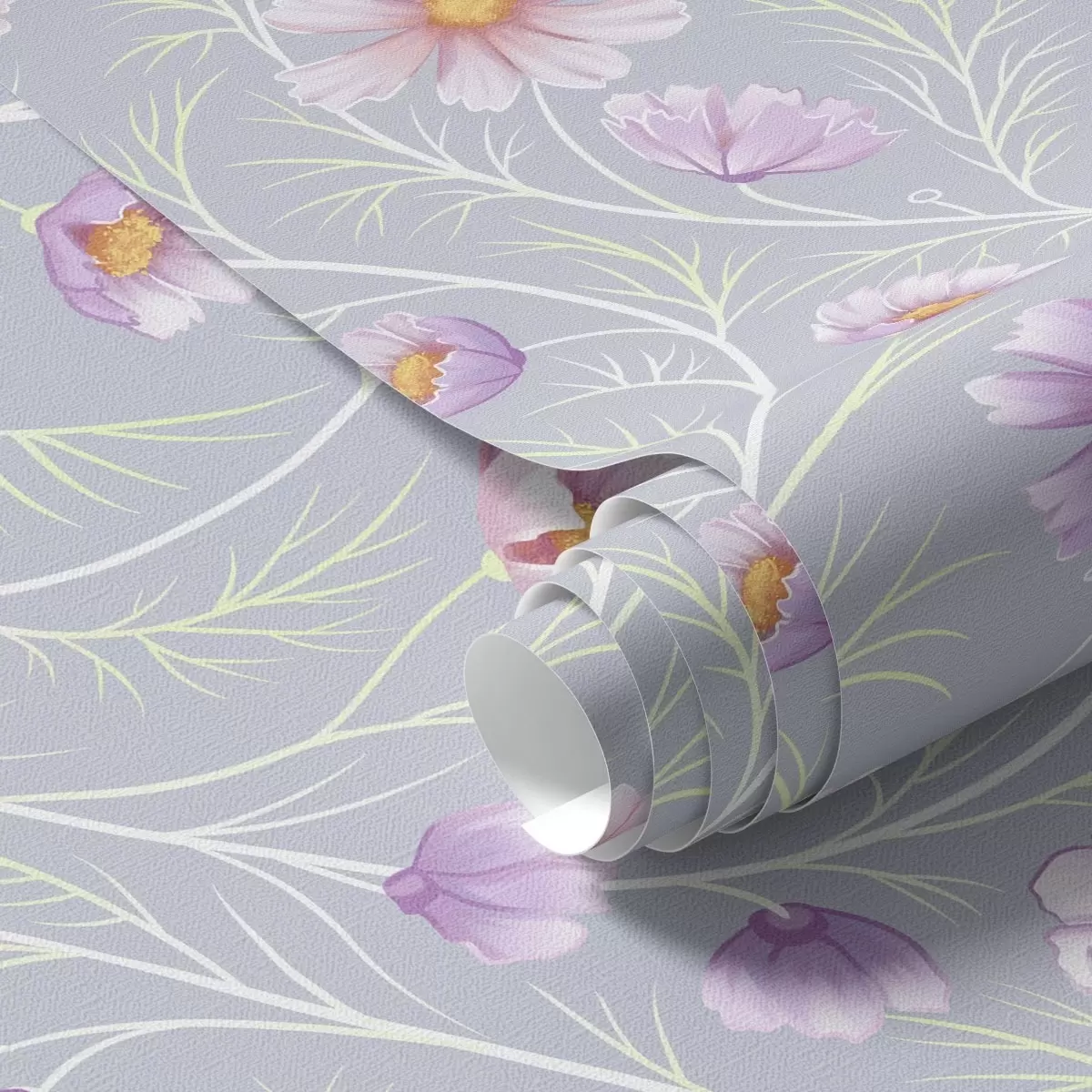 Tapetes Rozā kosmos un slaidi stublāji uz pelēka fona Nr. a00791