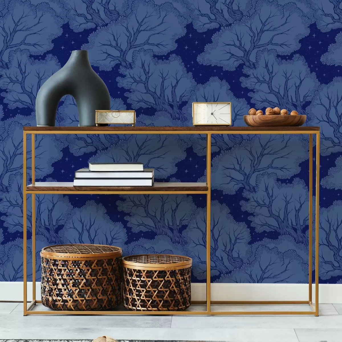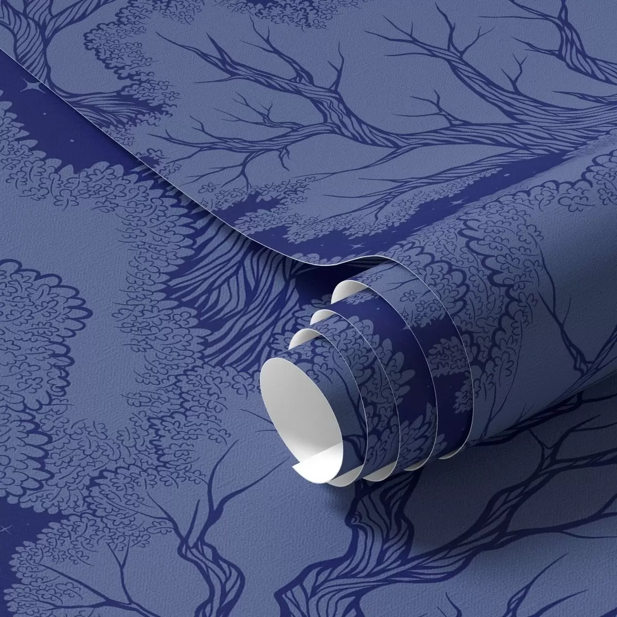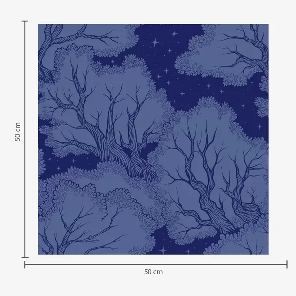 Tapetes Koku silueti zem zvaigžņotām debesīm zilo toņu krāsās Nr. a00798