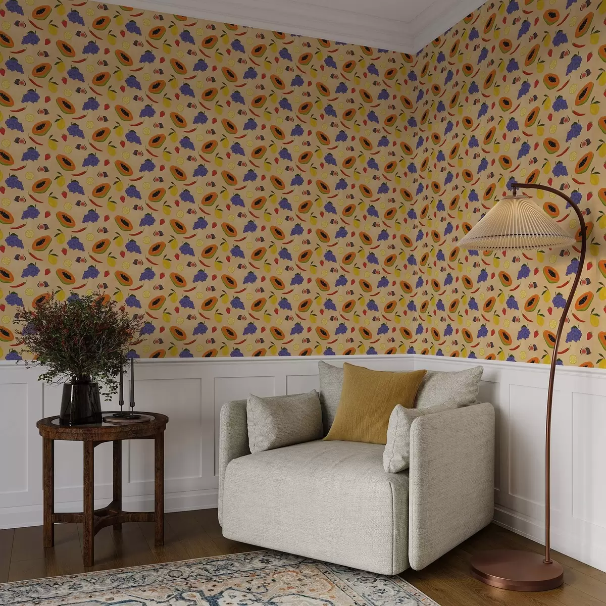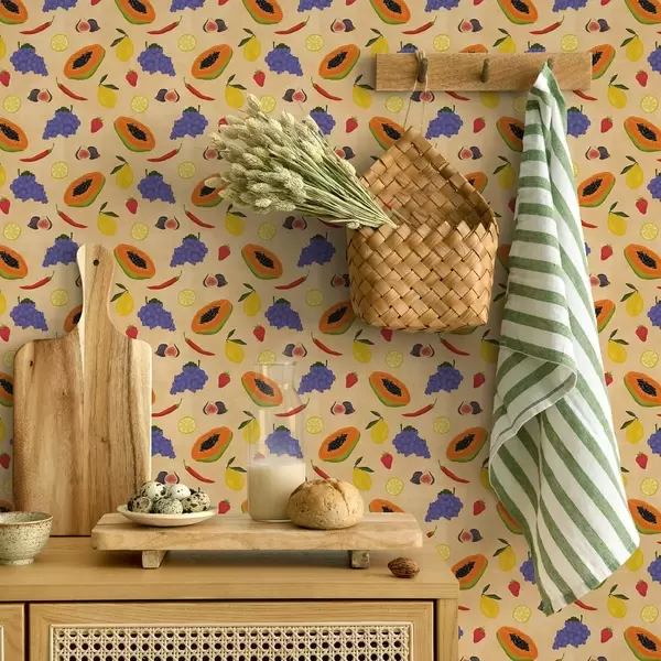 Tapetes Papaja, citrusaugļi un ogas uz bagātīga, siltā fona Nr. a00803v1