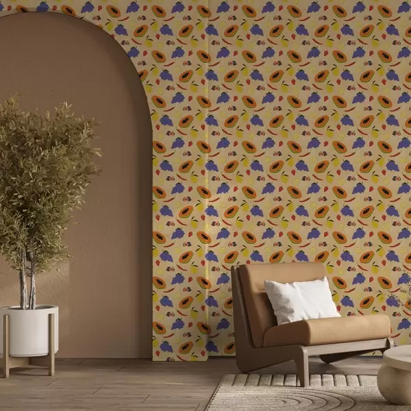 Tapetes Papaja, citrusaugļi un ogas uz bagātīga, siltā fona Nr. a00803v1
