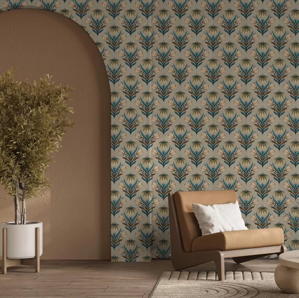 Tapetes Simetriskas ziedu ornamenta siltos toņos Nr. a00812