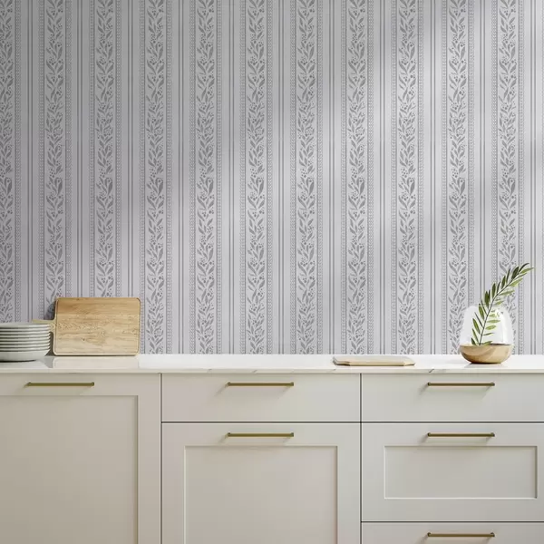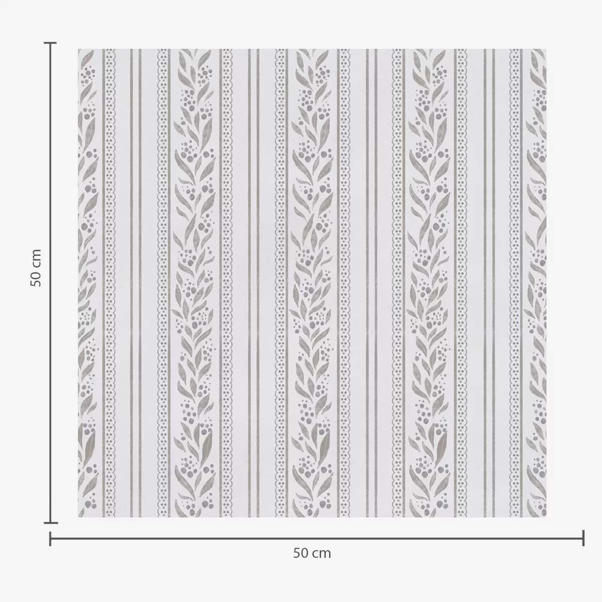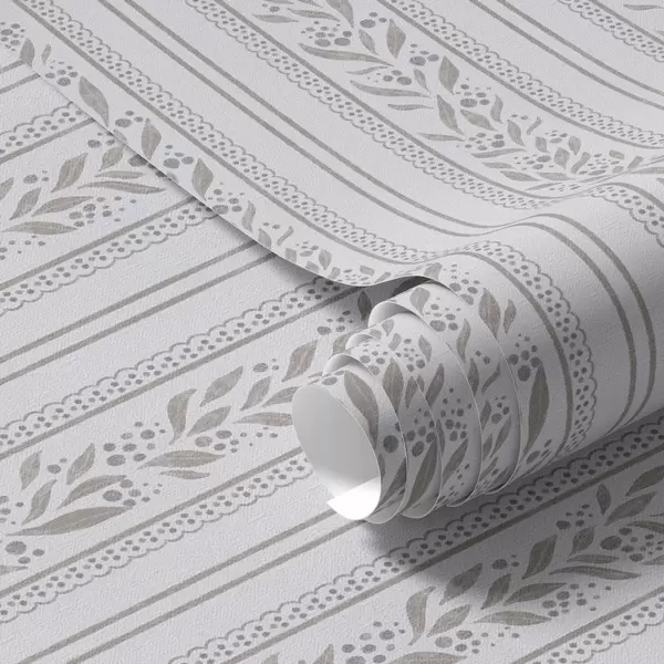 Tapetes Svītras ar mežģīnēm un zariņiem uz vēsā balta fona Nr. a00814v1