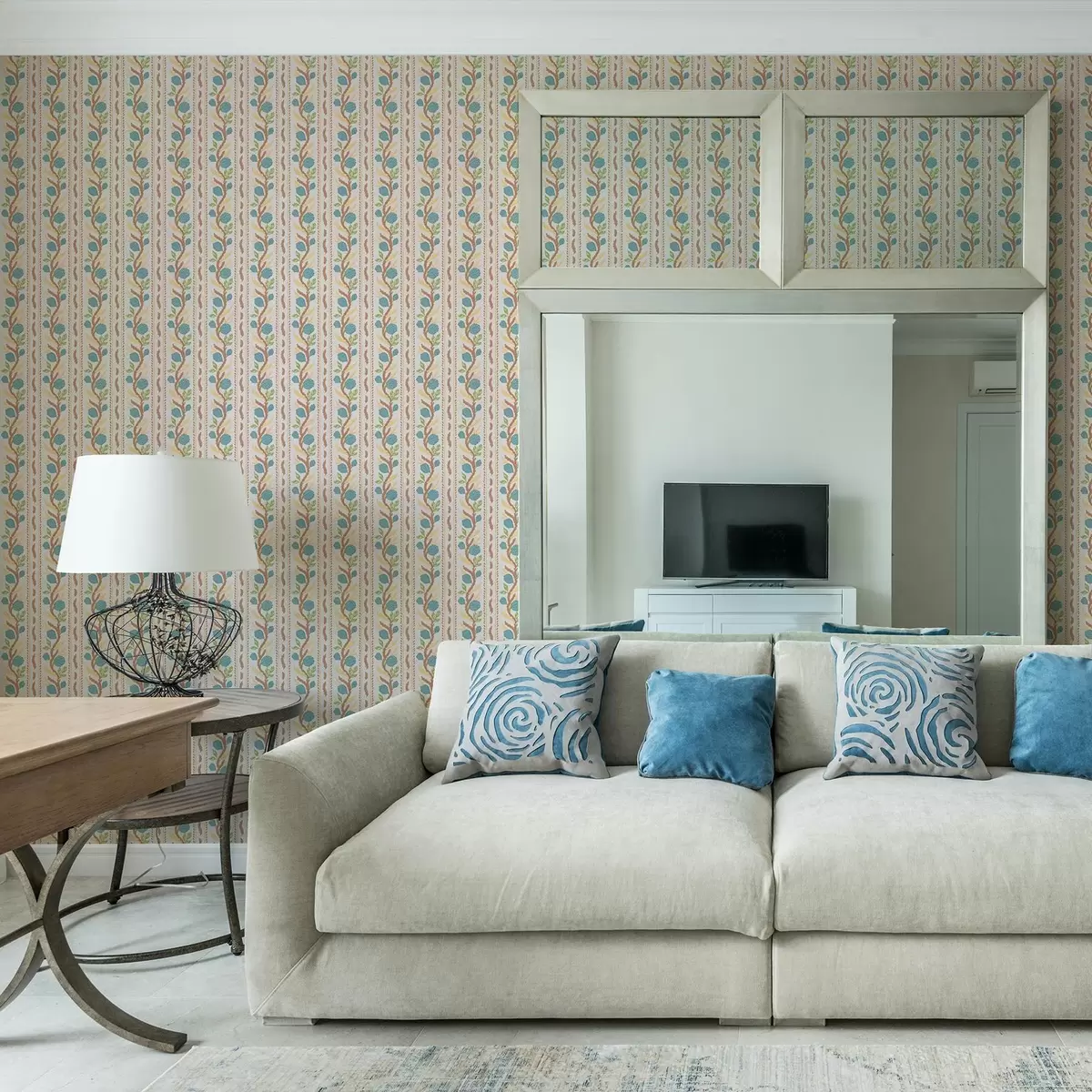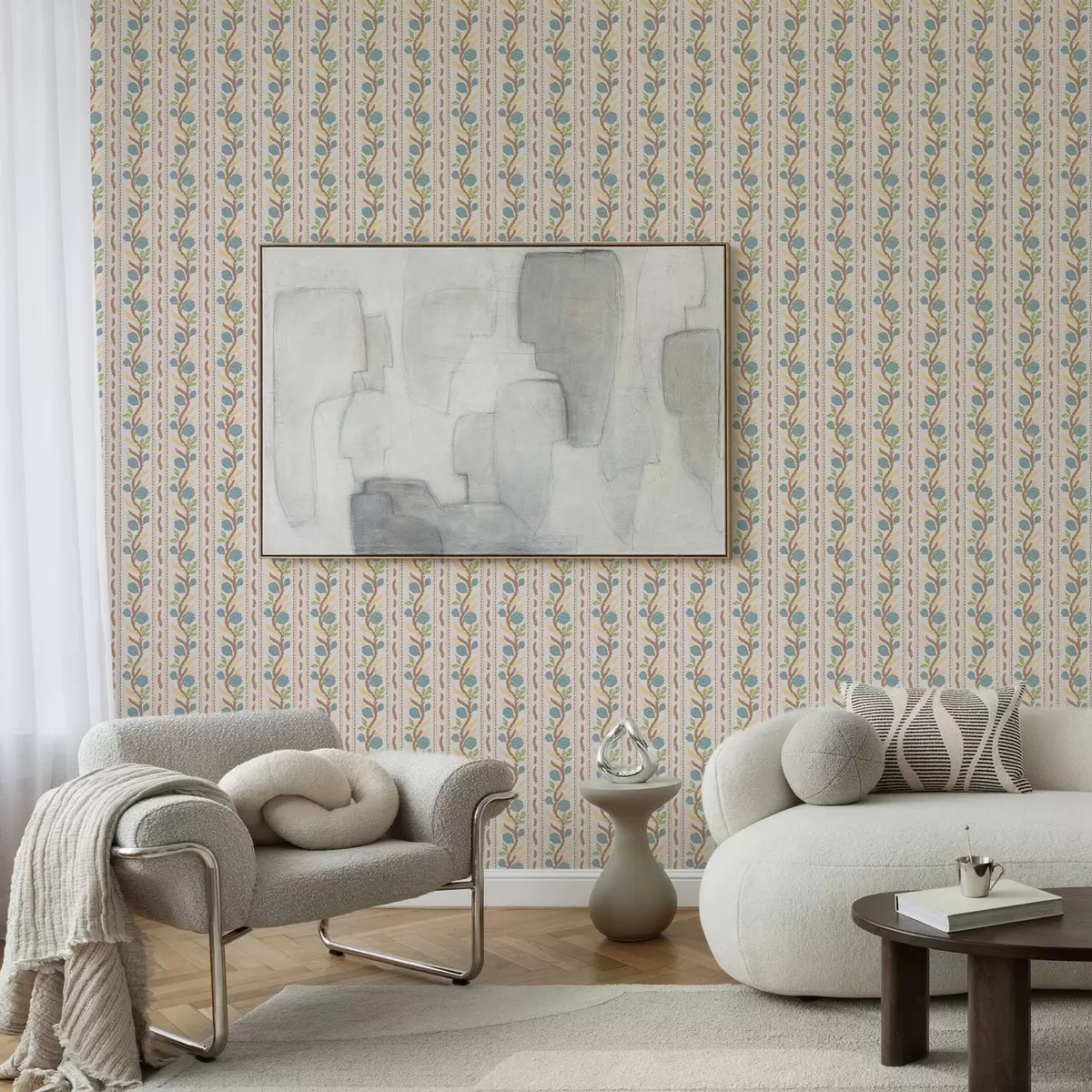 Tapetes Vertikālas pušķa svītras ar ziliem ziediem uz siltā fona Nr. a00816v3