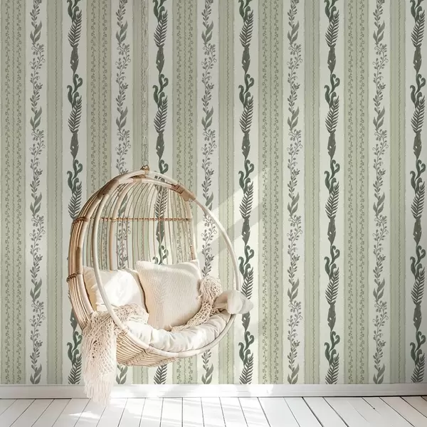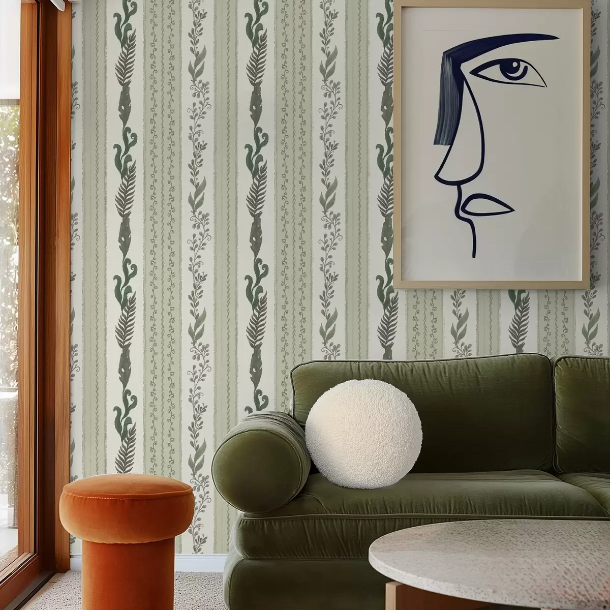 Tapetes Svītras ar zariem zaļos un pelēkos toņos, maigs kontrasts Nr. a00824