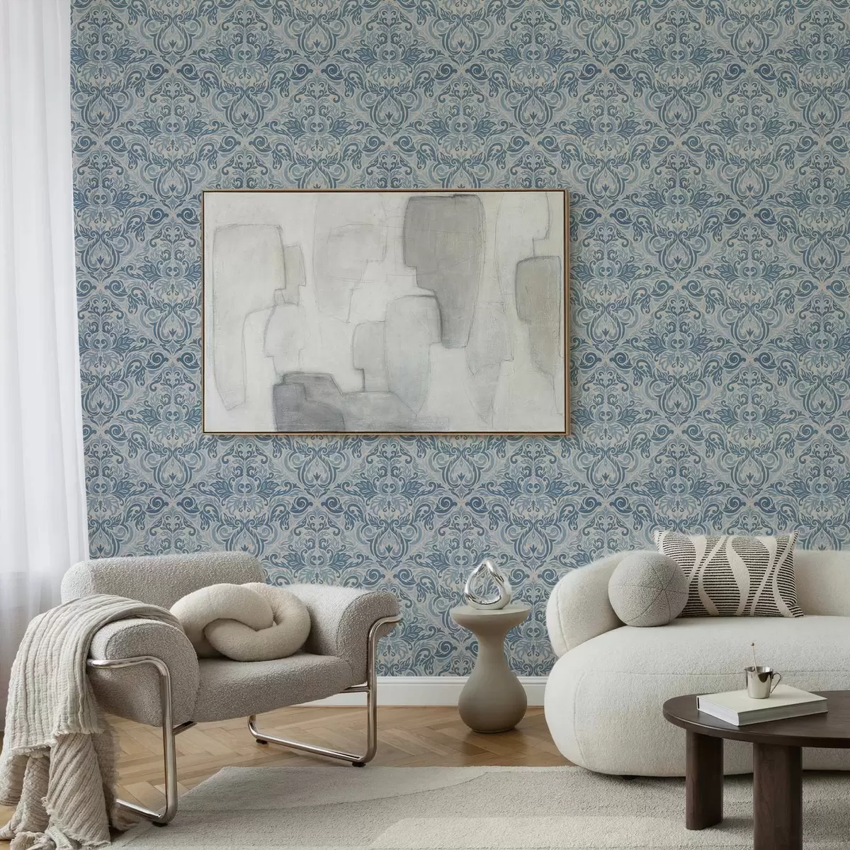 Tapetes Klasisks damasts, zili motīvi uz krēmkrāsas fona Nr. a00826v1