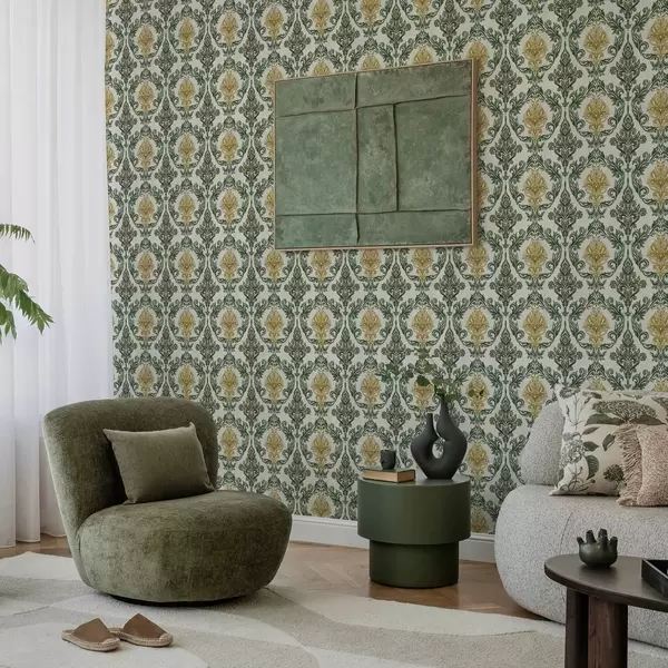 Tapetes Damasts ar zaļām volūtām uz gaiša fona Nr. a00828v1