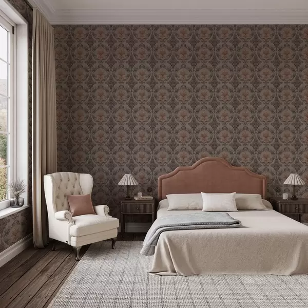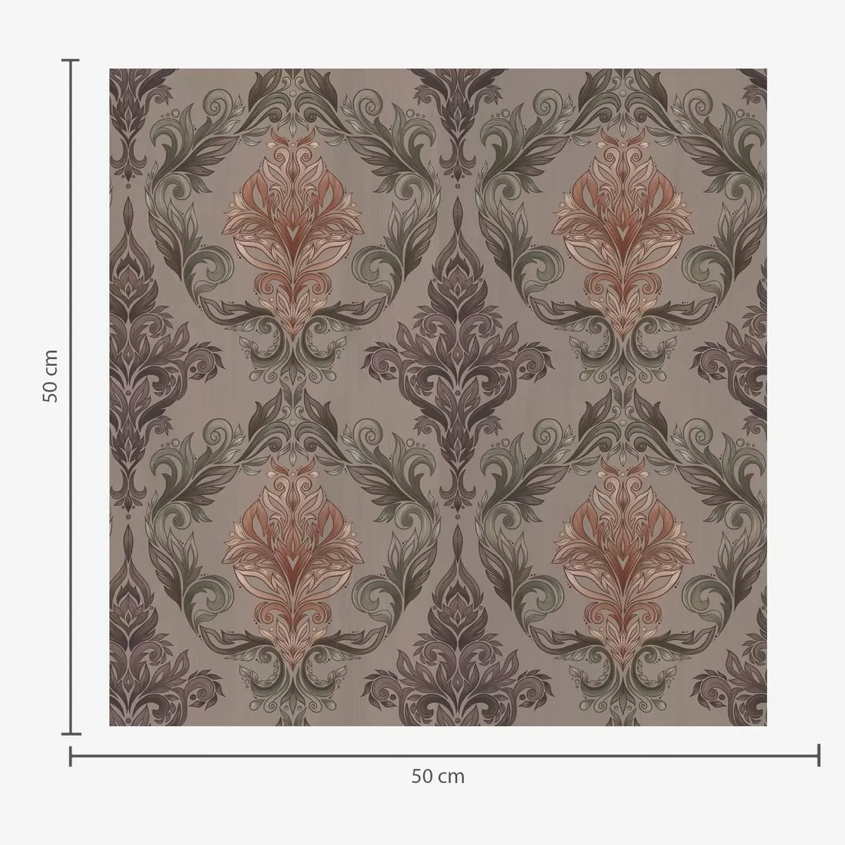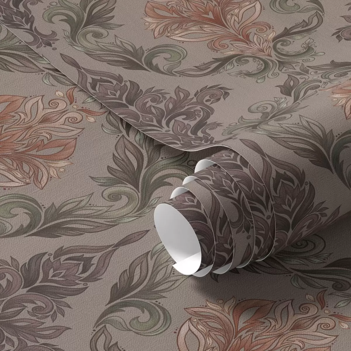 Tapetes Damasts brūnā–terakotas krāsu gamā, siltā pelēkā fonā Nr. a00828v2