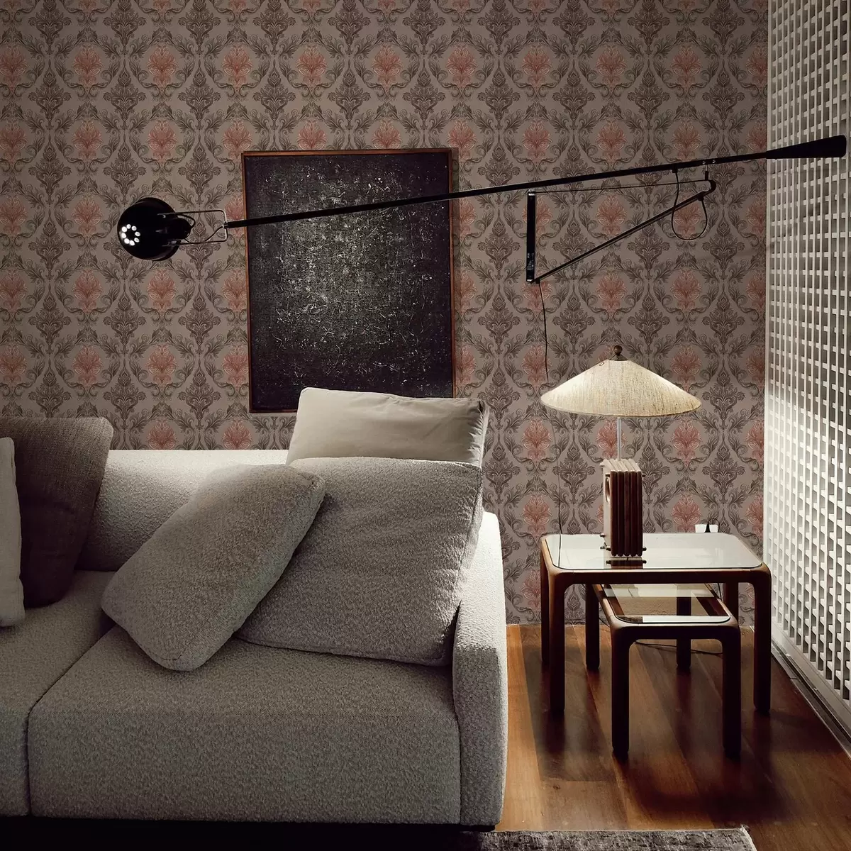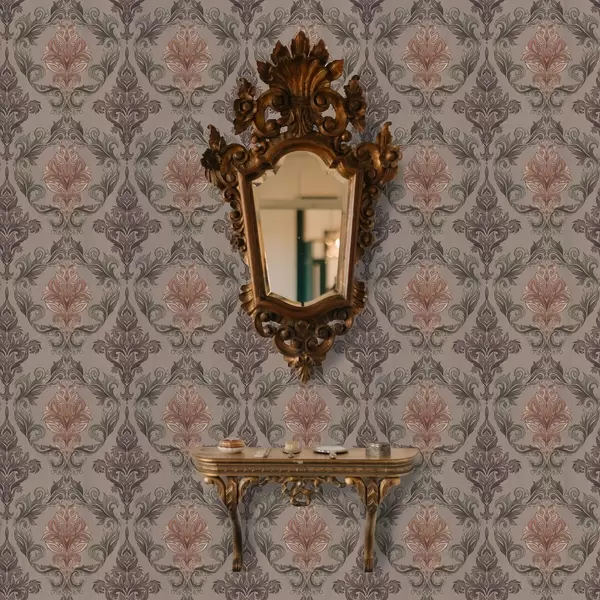Tapetes Damasts brūnā–terakotas krāsu gamā, siltā pelēkā fonā Nr. a00828v2
