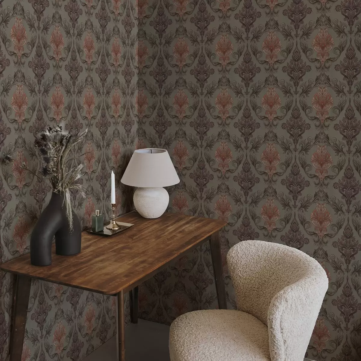 Tapetes Terakotas damasts uz klusināta olīvu fona Nr. a00828v3