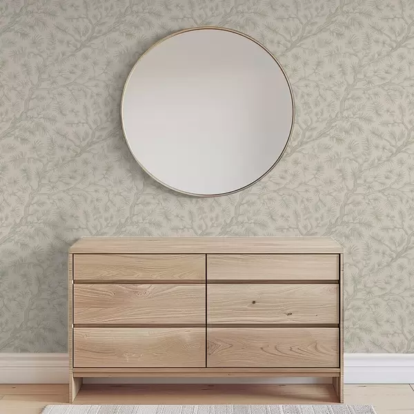 Tapetes Priežu zari gaiši zaļos toņos uz smilškrāsas fona Nr. a00838v1