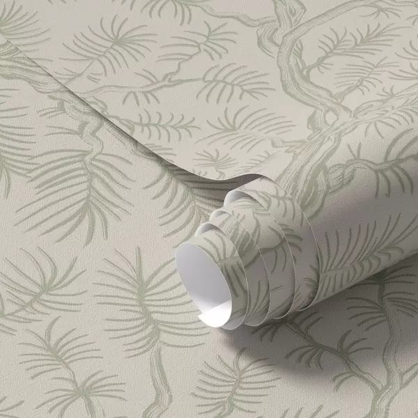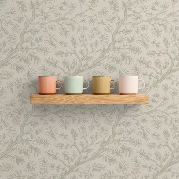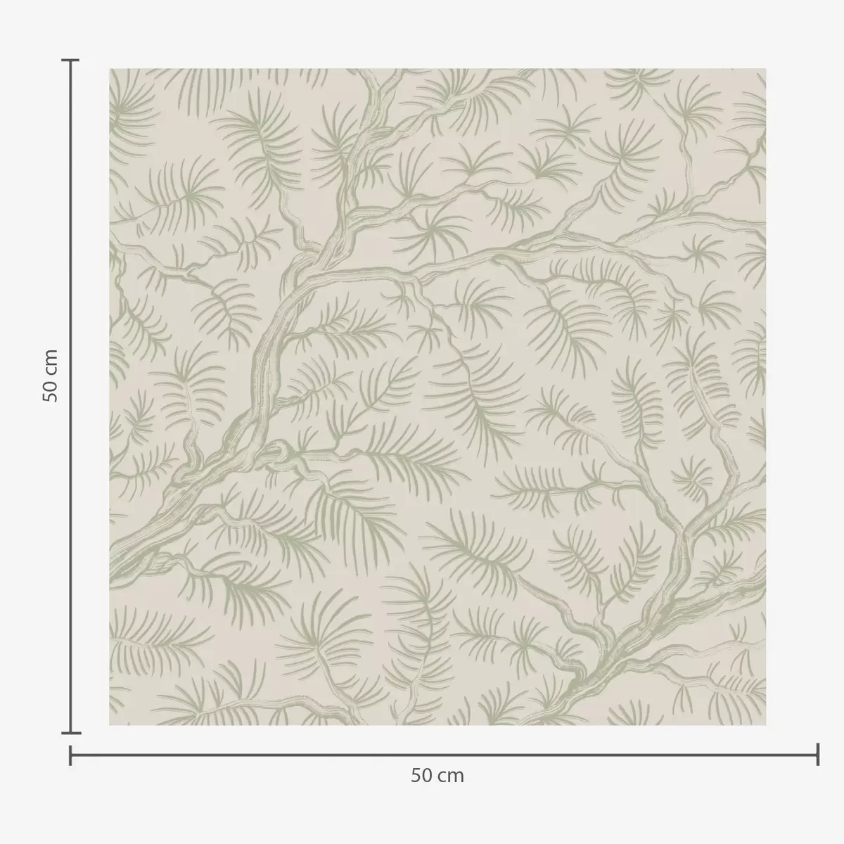 Tapetes Priežu zari gaiši zaļos toņos uz smilškrāsas fona Nr. a00838v1