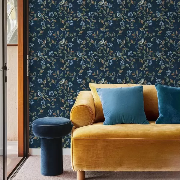 Tapetes Krūtiņas uz zariem, nakts zils fons ar dzirkstelēm Nr. a00858