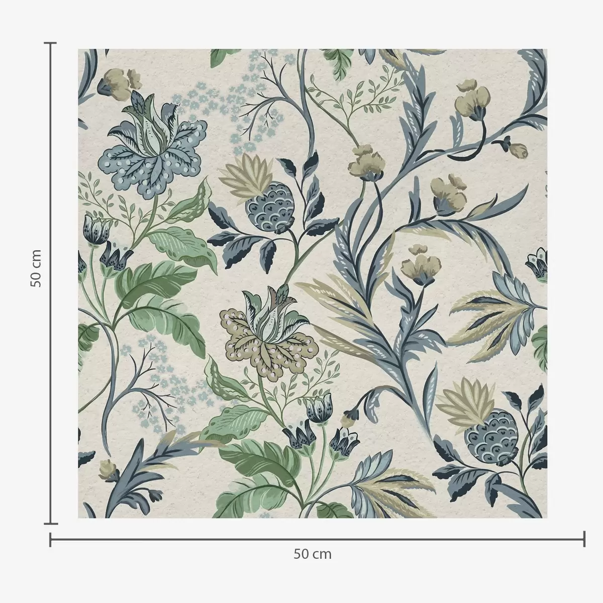 Tapetes Zilzaļi tautas ziedi un lapas uz krēmkrāsas fona Nr. a00863