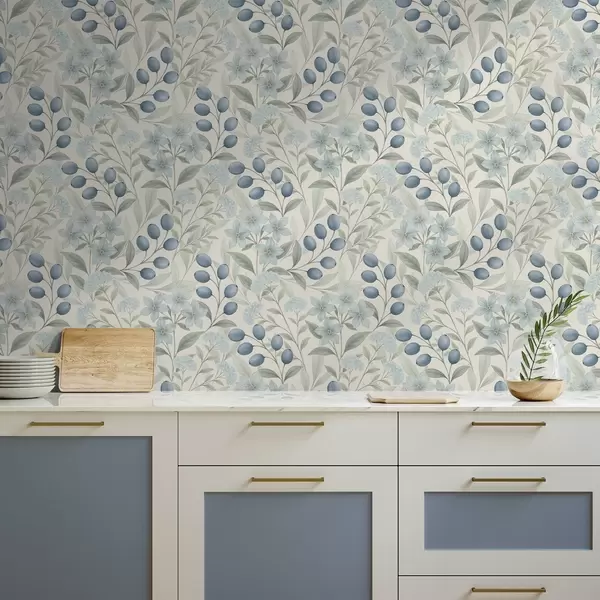 Tapetes Zilas ogas un gaiši ziedi uz ziloņkaula Nr. a00872