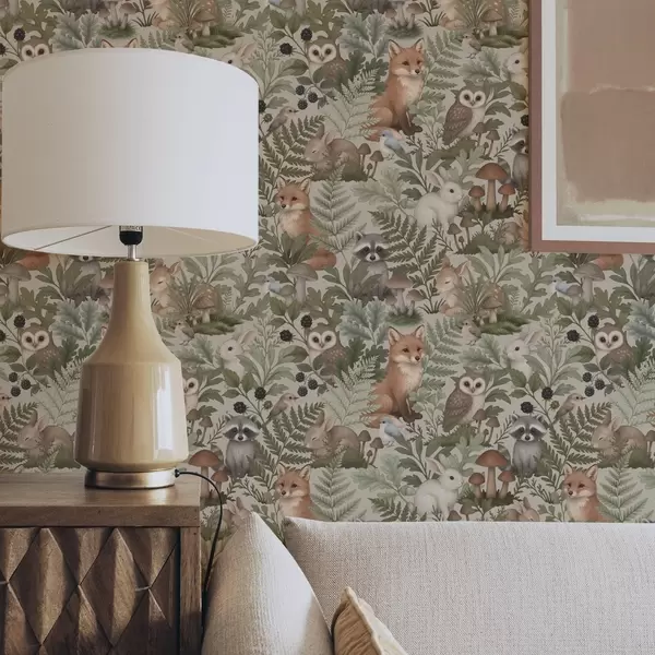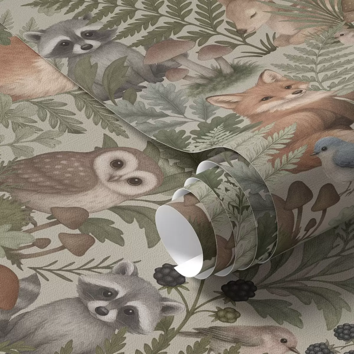 Tapetes Meža dzīvnieki, papardes un sēnes uz gaiši smilškrāsas fona Nr. a00880v1