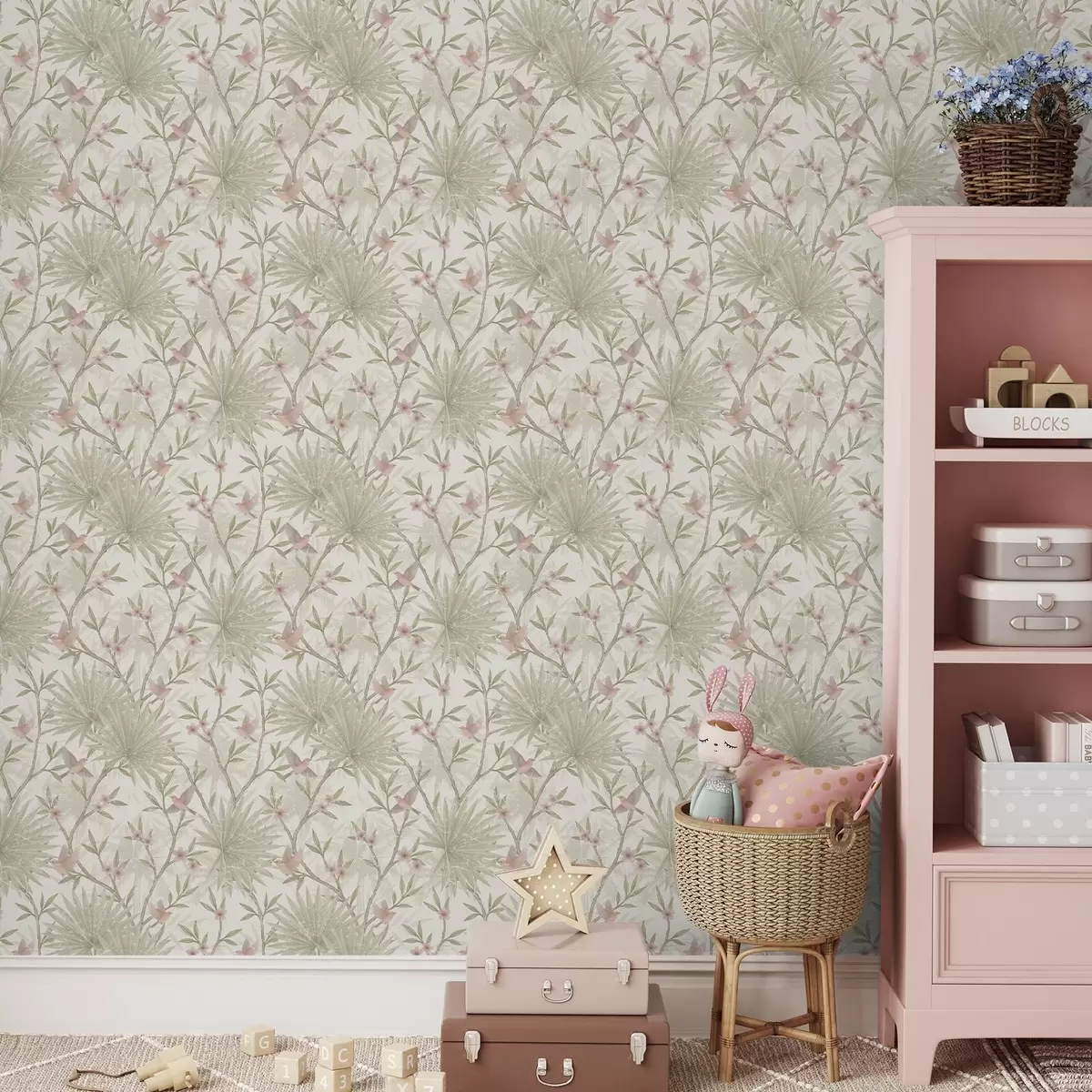 Tapetes Maigi rozā putni palmu lapās Nr. a00883