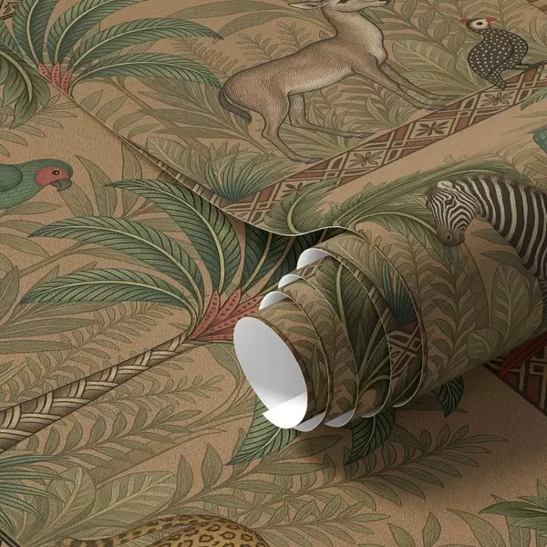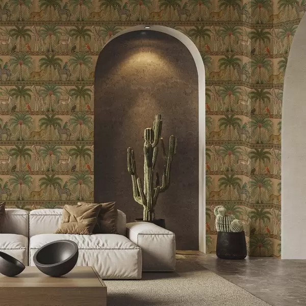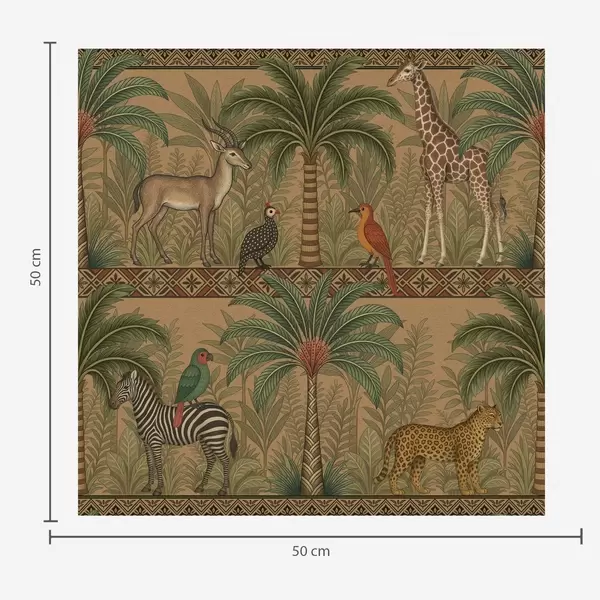 Tapetes Dekoratīvi savannas dzīvnieki starp palmām un apmales Nr. a00898