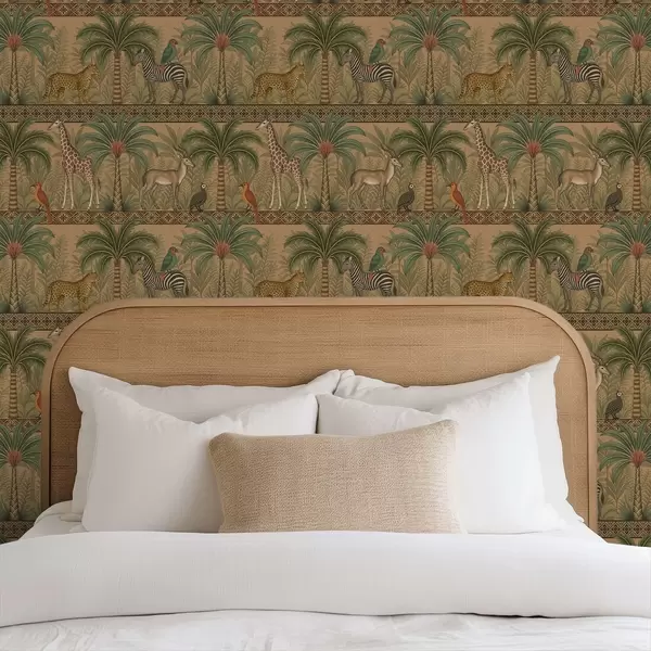 Tapetes Dekoratīvi savannas dzīvnieki starp palmām un apmales Nr. a00898