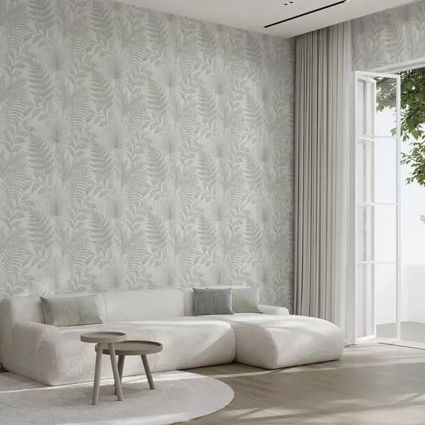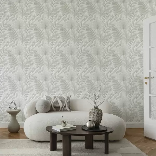 Tapetes Mīkstas tropu lapas gaiši pelēkā krāsā uz lina tekstūras Nr. a00899