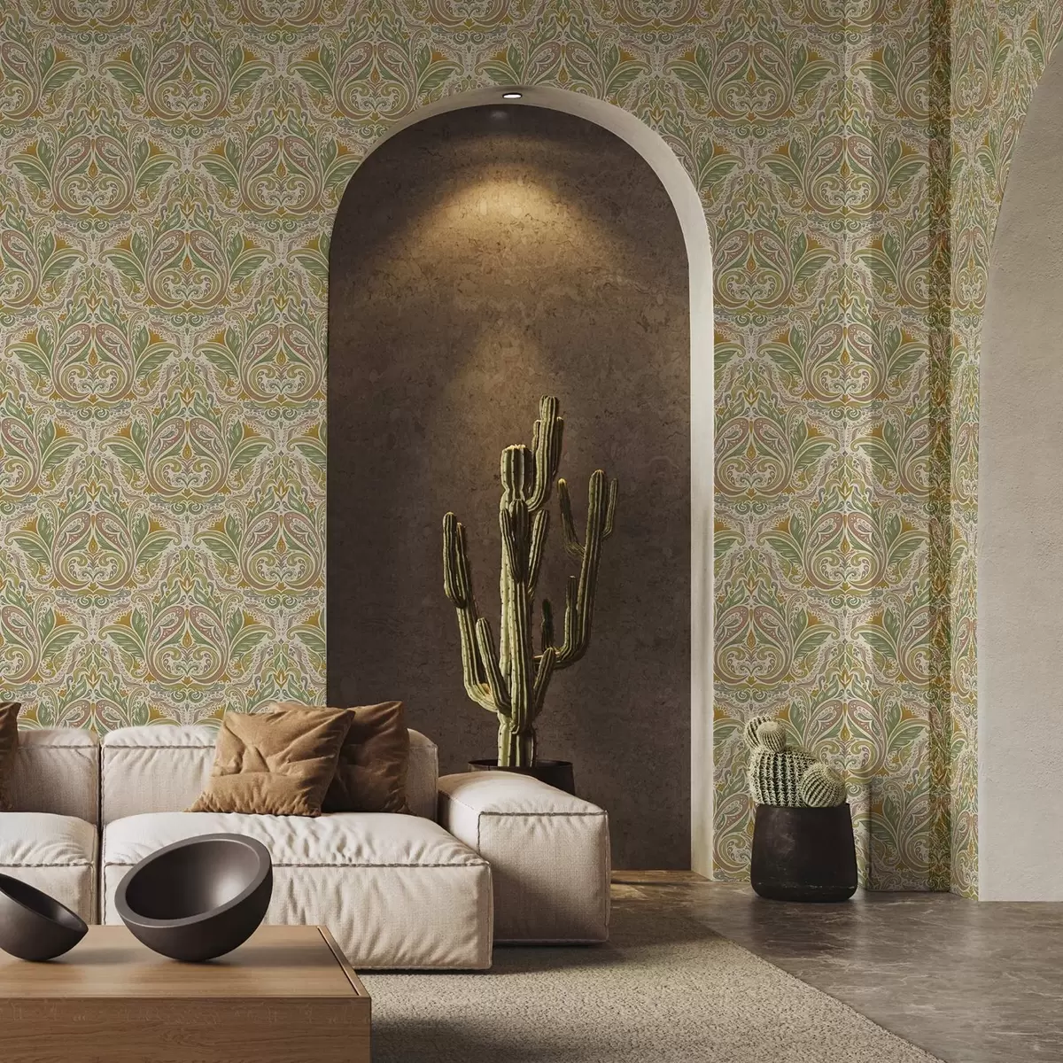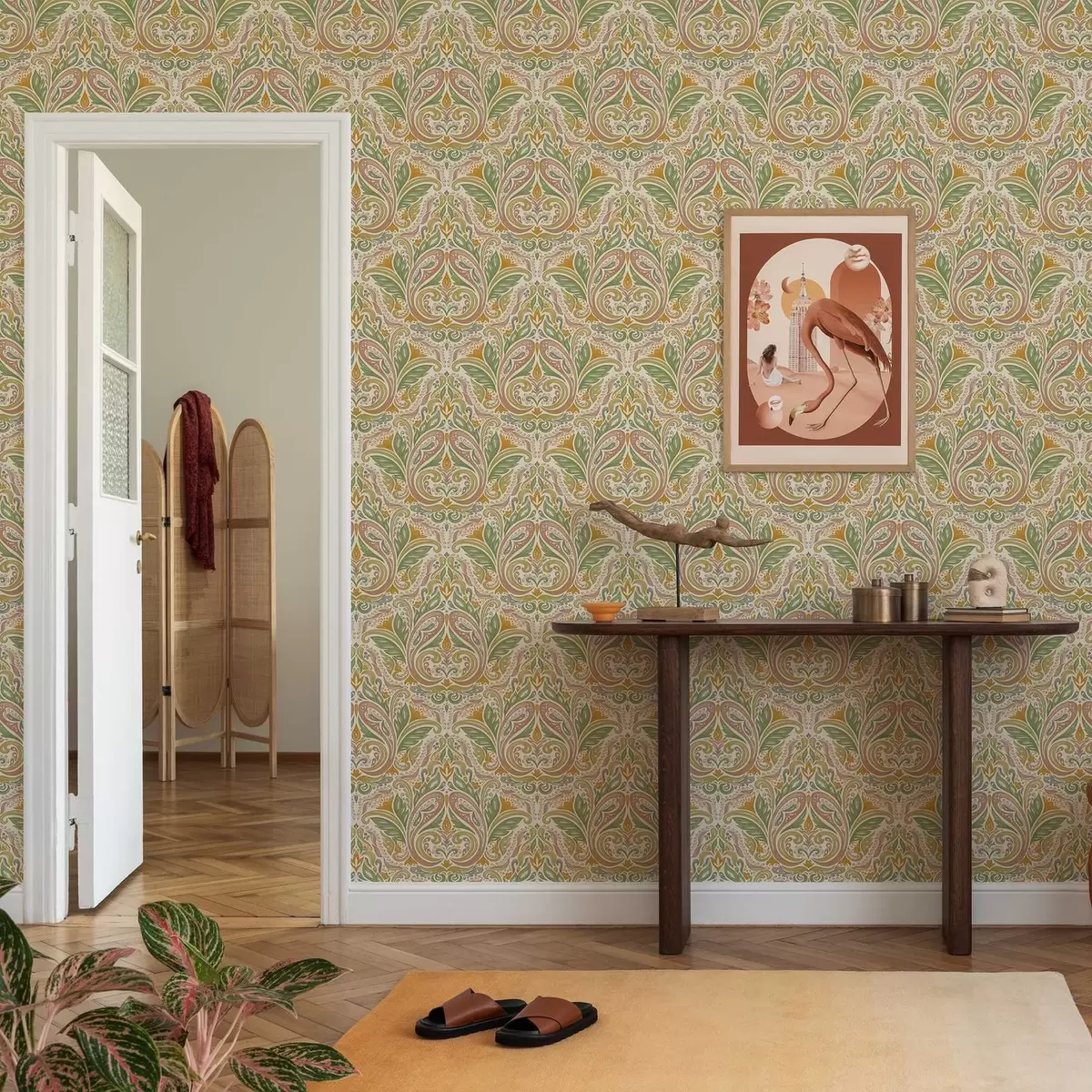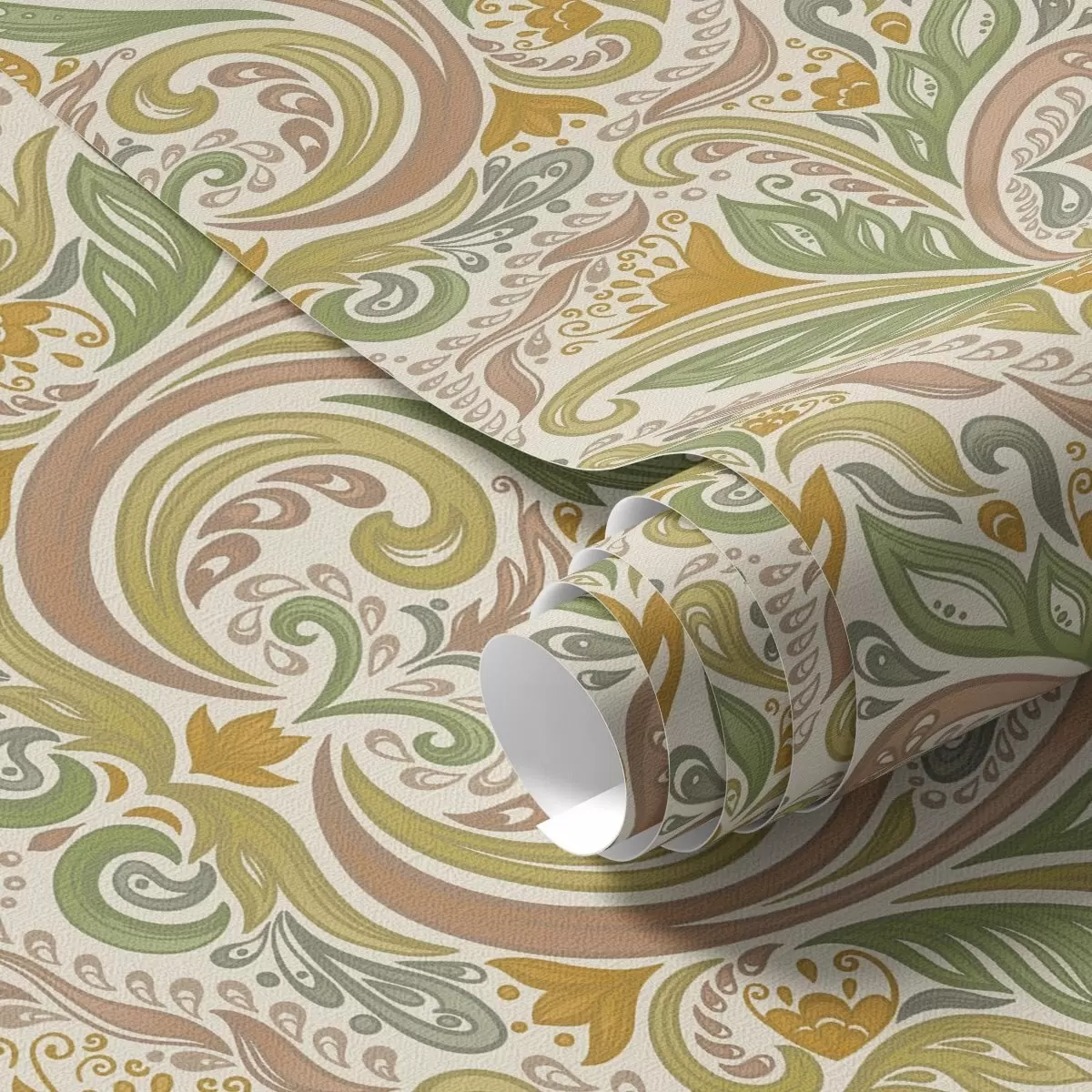 Tapetes Dekoratīvi lapu virpuļi zaļos un terakotas toņos Nr. a00927v1