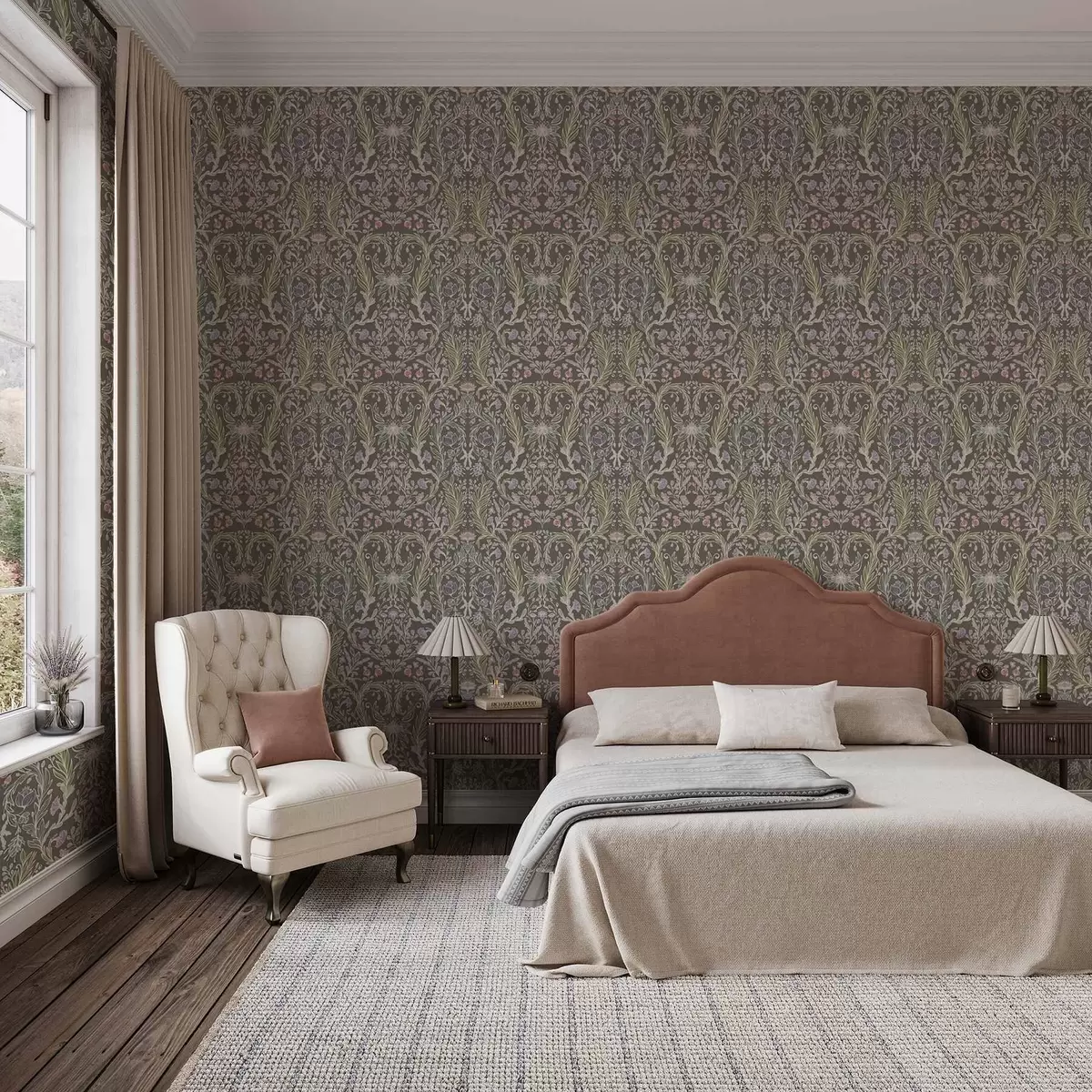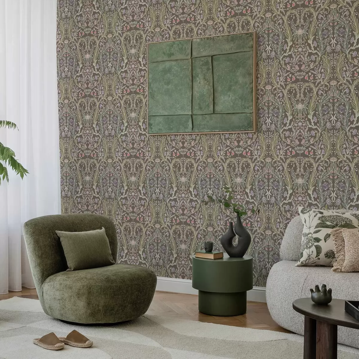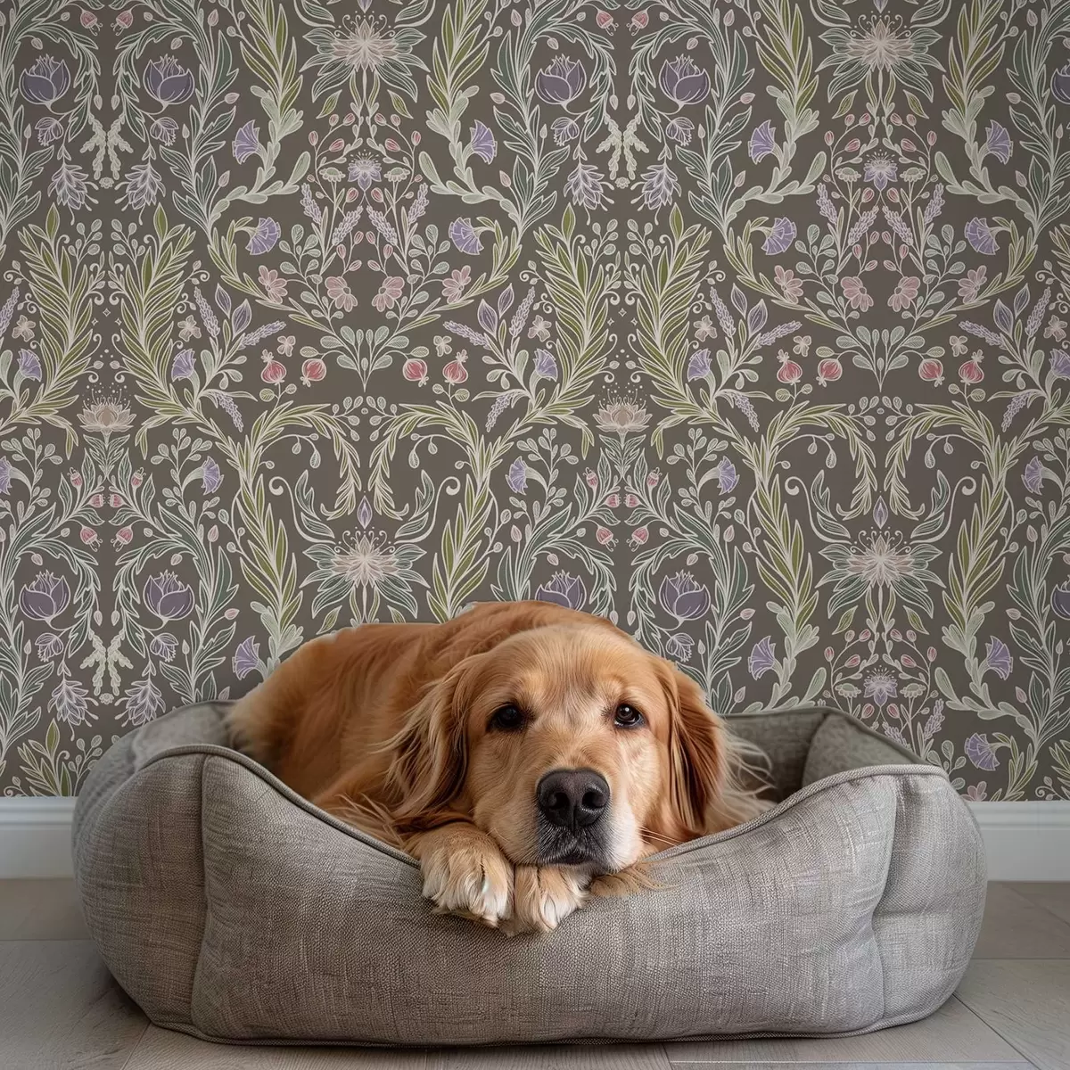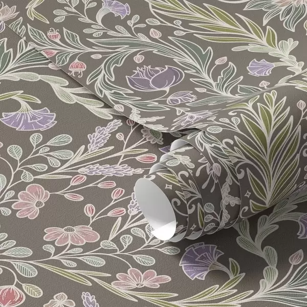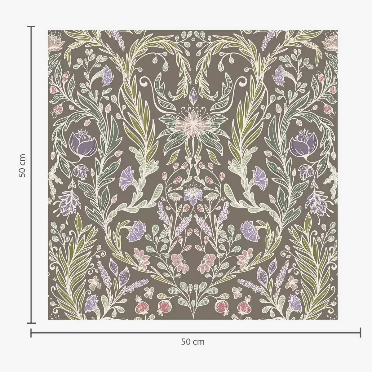 Tapetes Simetriskas ziedi un lapas uz brūngani pelēka fona Nr. a00928v2