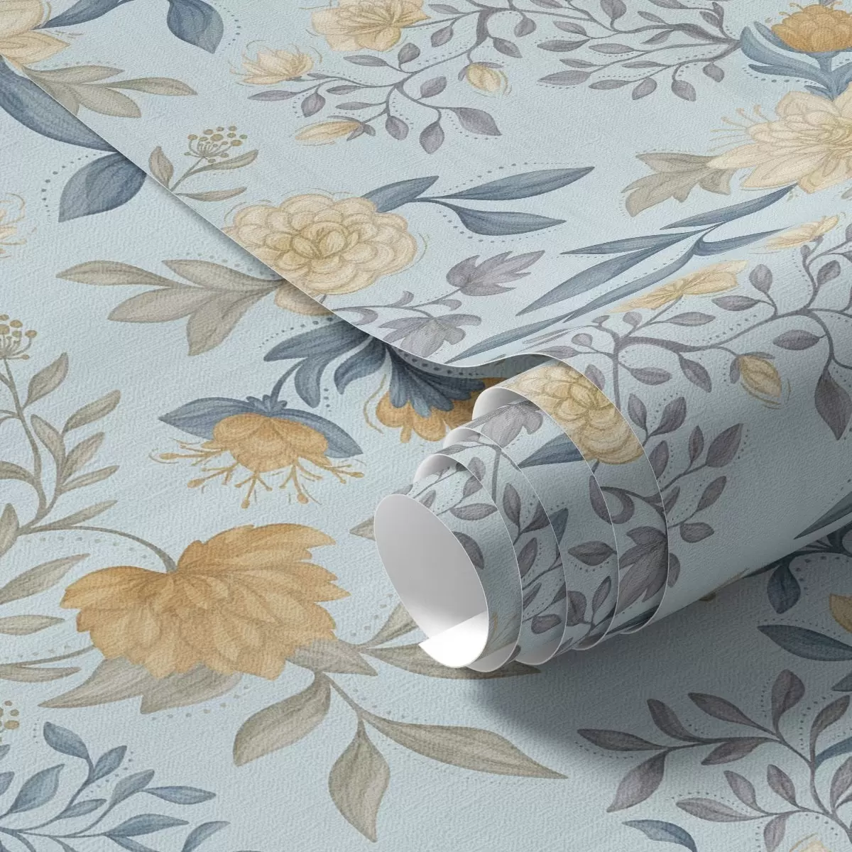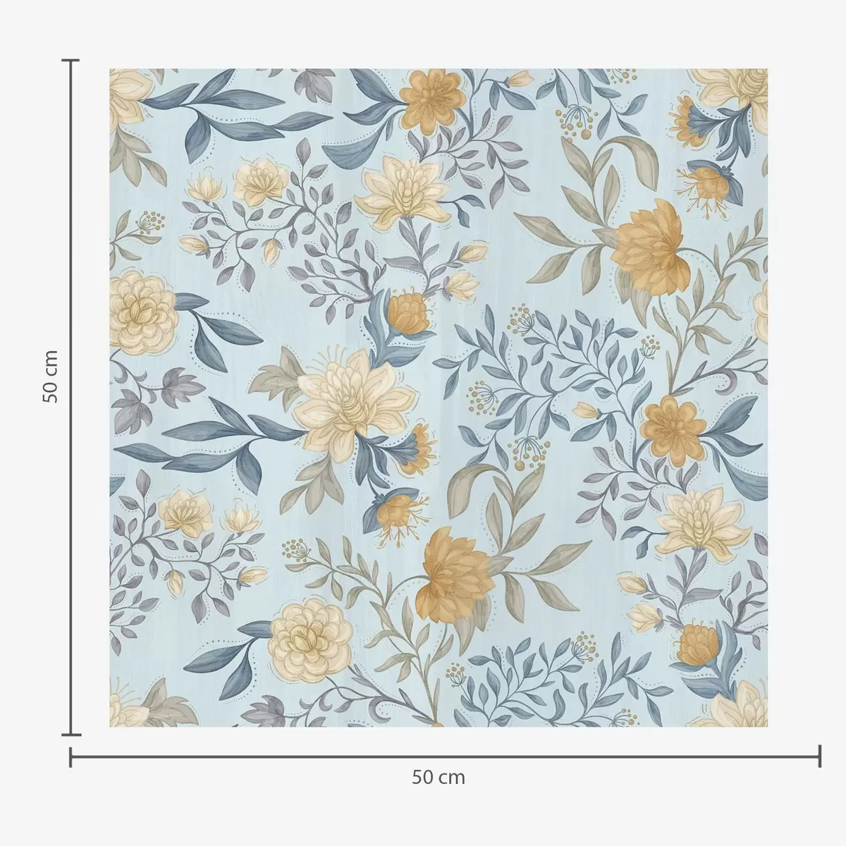 Tapetes Dzeltenas un zilas puķes ar lapām uz debeszilā fona Nr. a00934